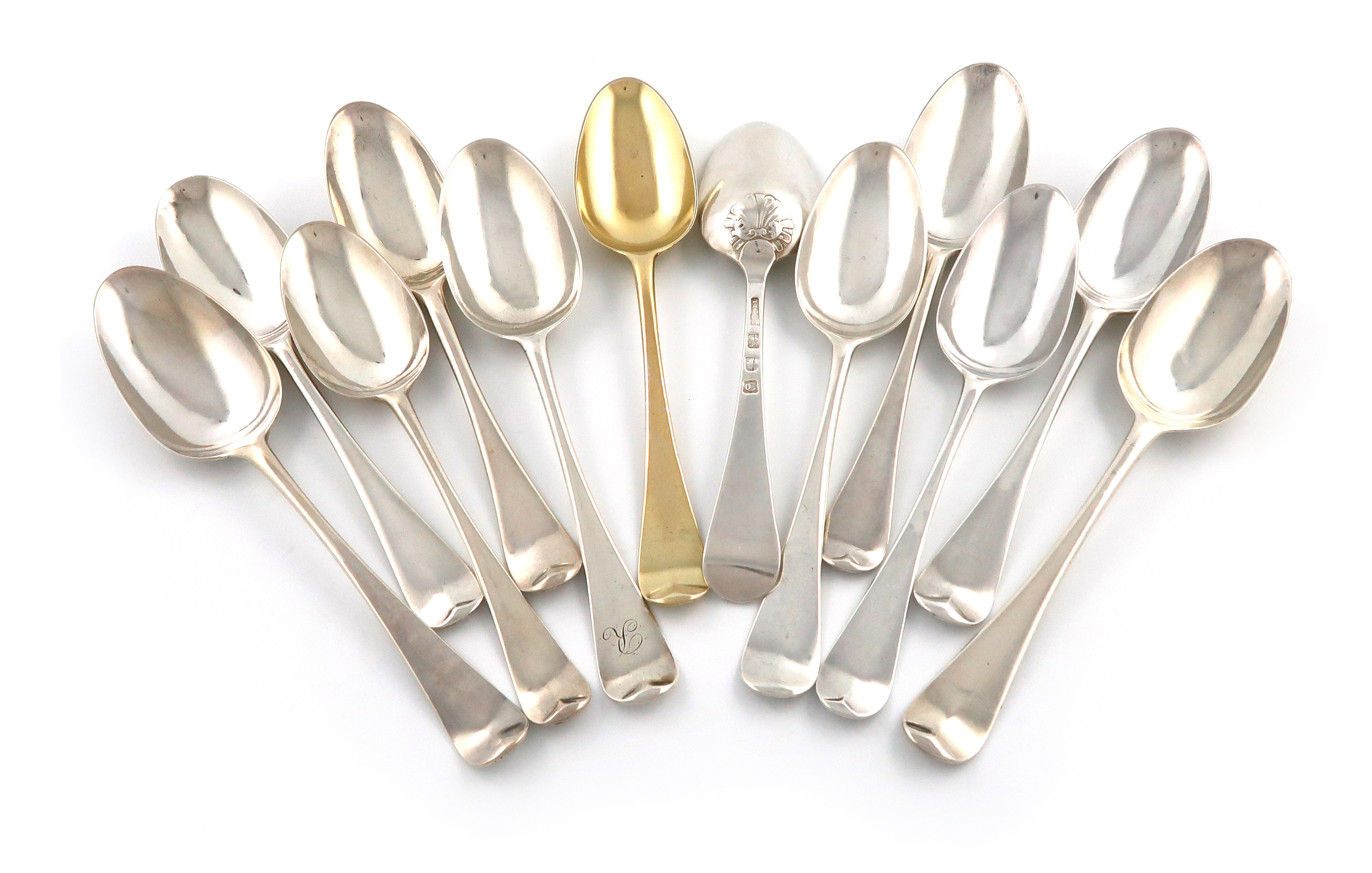 A collection of twelve antique silver and silver-gilt Hanoverian pattern tablespoons