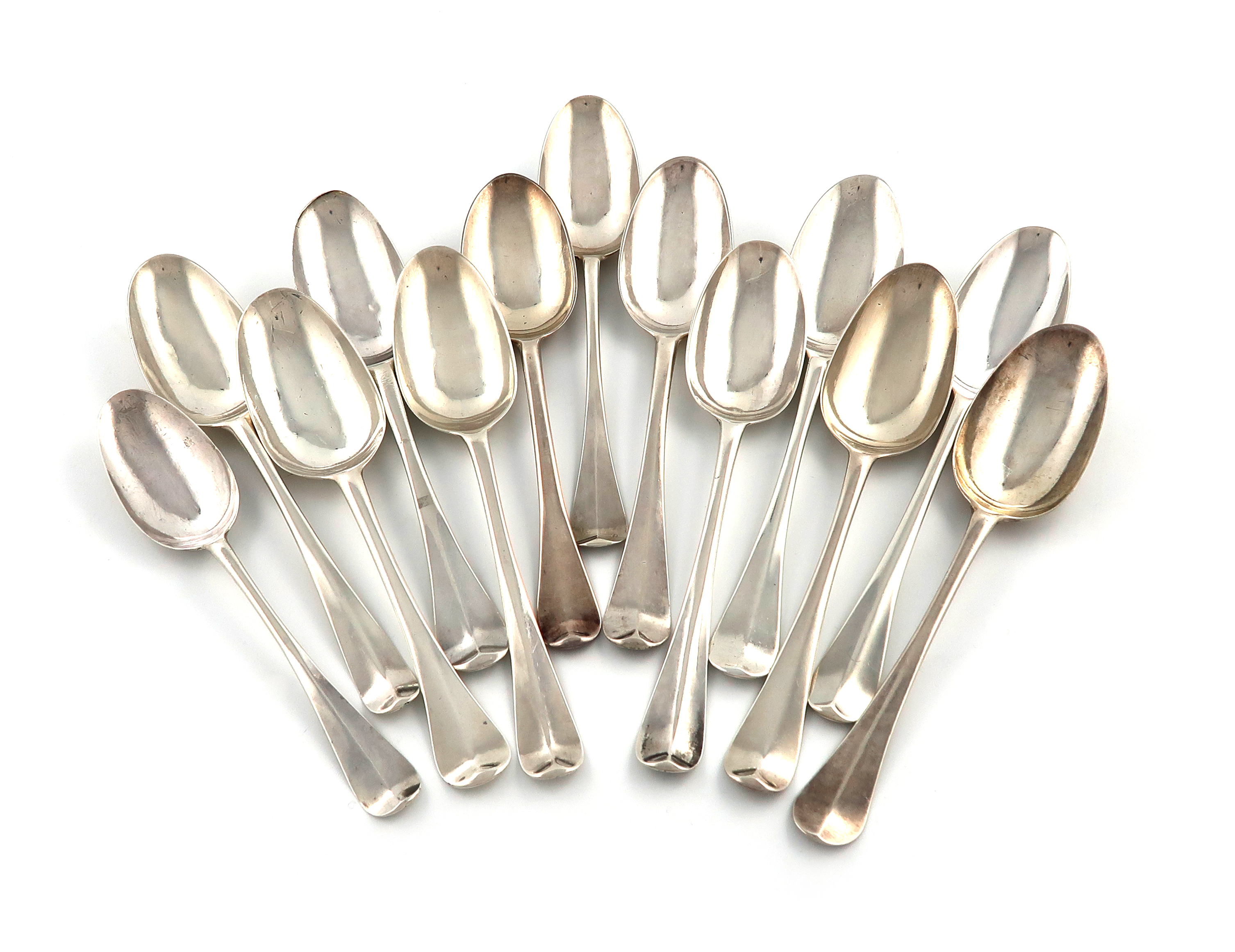 A collection of thirteen George II silver Hanoverian pattern tablespoons