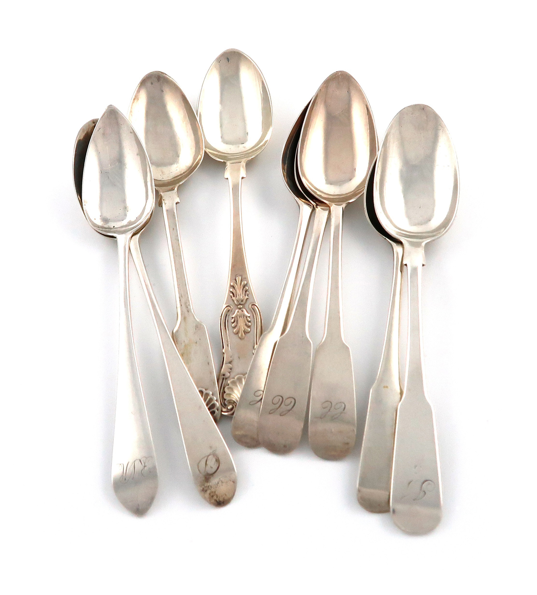 including provincial examples: a set of three, probably from Montrose, one by Robert Keay, Perth, one by William Constable, Dundee, one by J. Clark, Greenock, plus others including one from Edinburgh, approx. weight 4oz. (9)