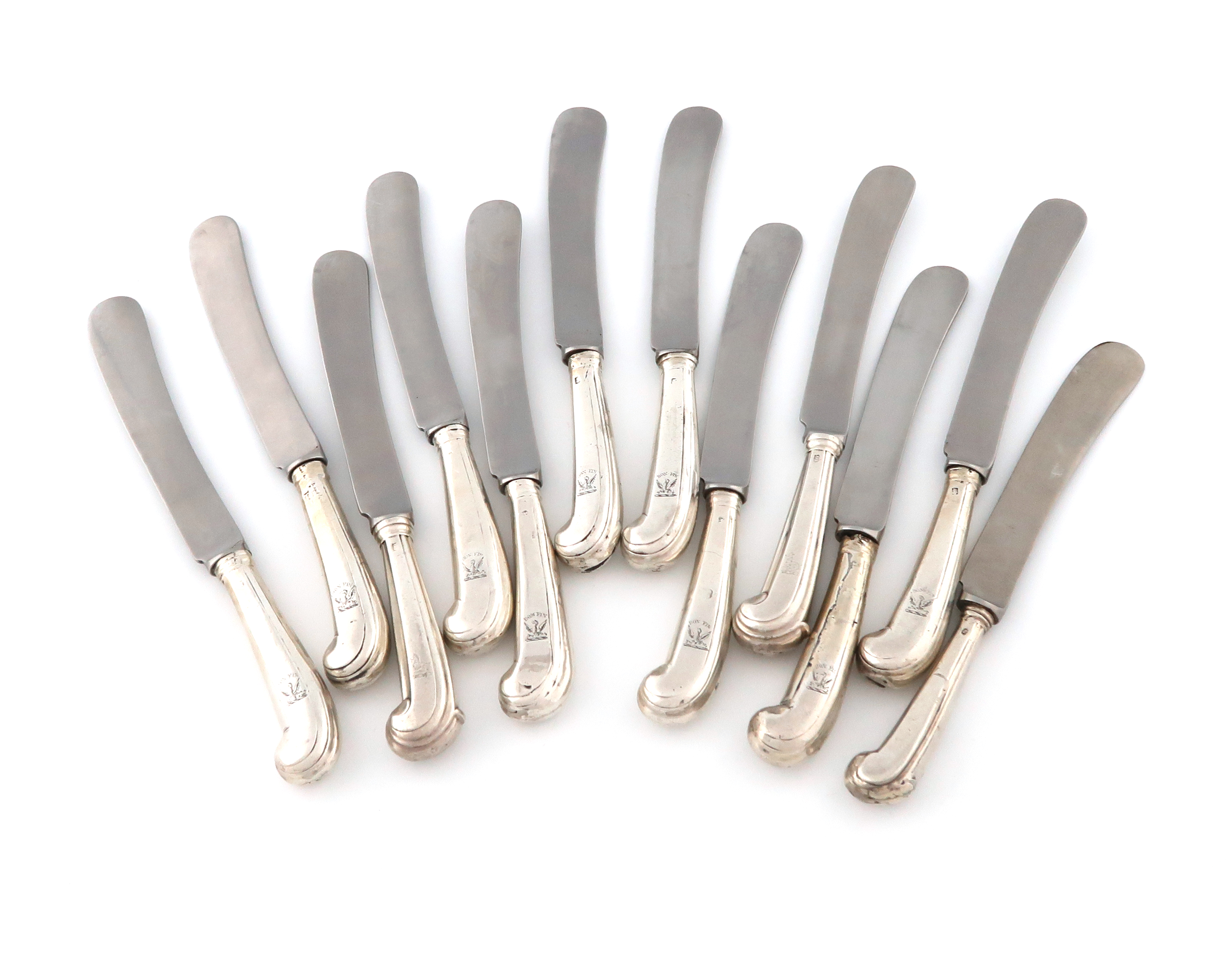 A matched set of twelve 18th century silver-handled Pistol-grip dessert knives