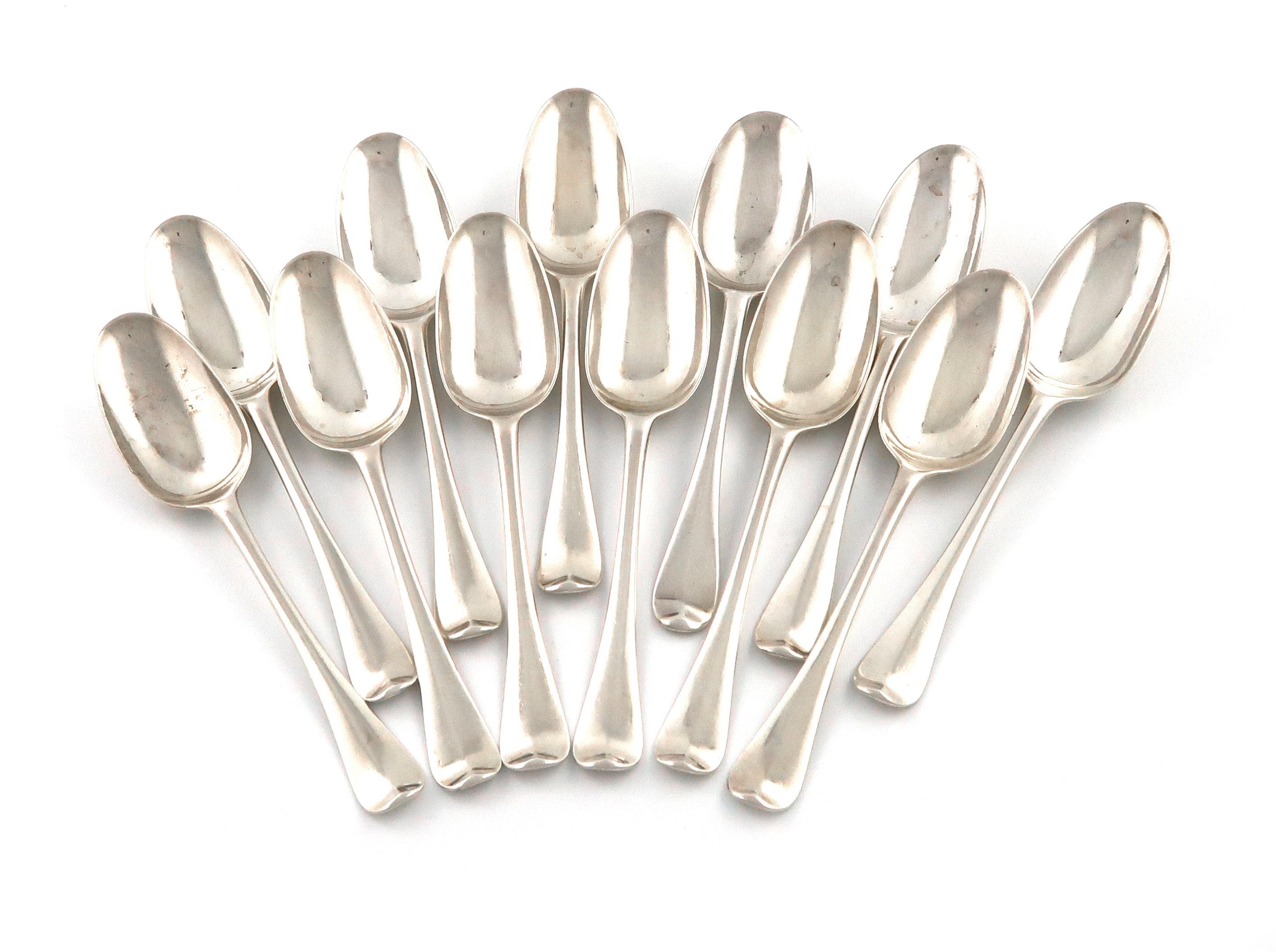 A matched set of twelve early 18th century silver Hanoverian Rat-tail pattern dessert spoons