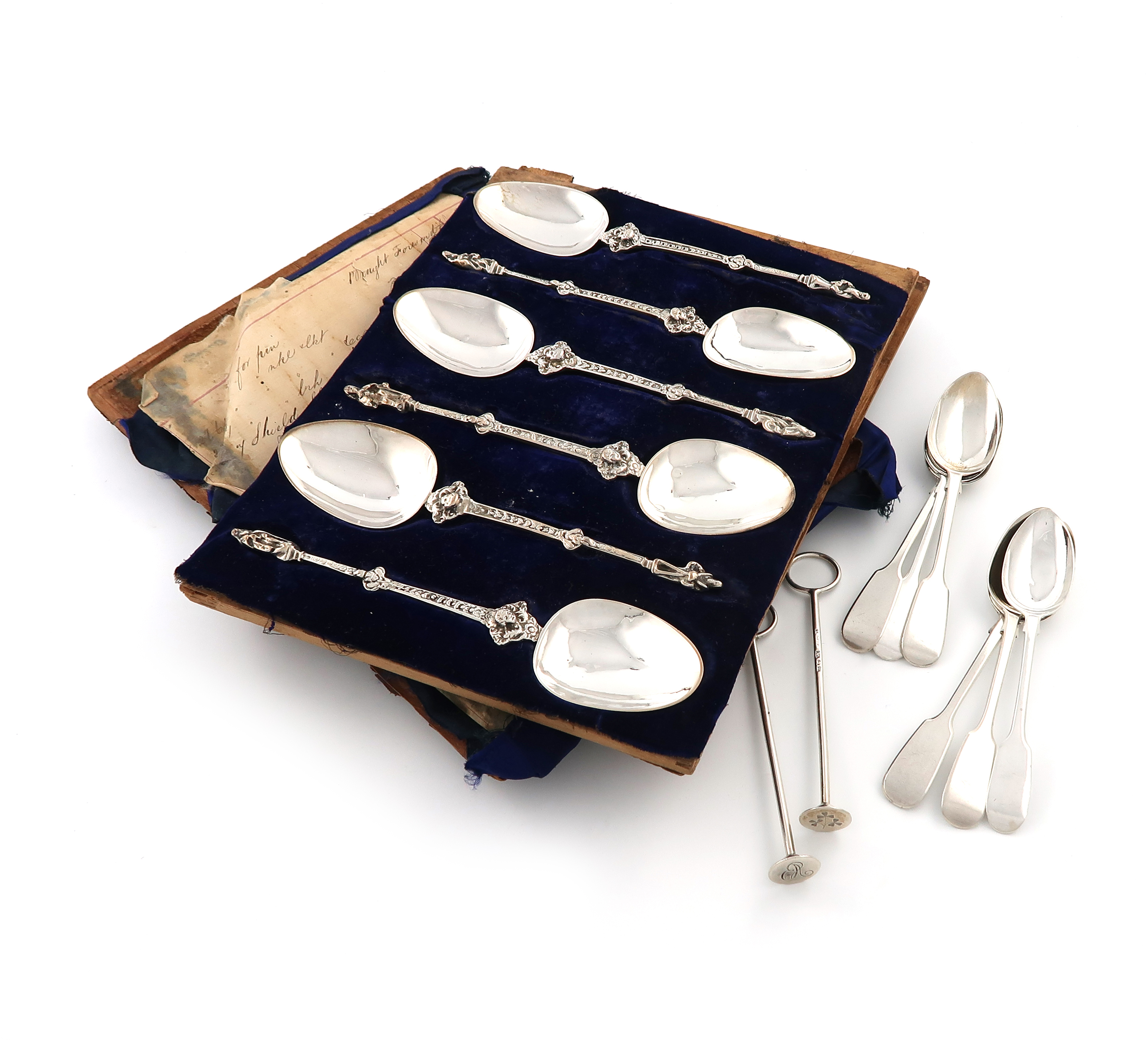comprising: a pair of George III silver sugar crushers, by T and J Settle, Sheffield 1817, plain ring handles, the bases with an initial and clover leaf, plus six Fiddle pattern teaspoons, and a cased set of six 19th century Dutch silver spoons, 1854, with figural terminals, and masks, the case a.f, approx. total weight 14.9oz. (qty)