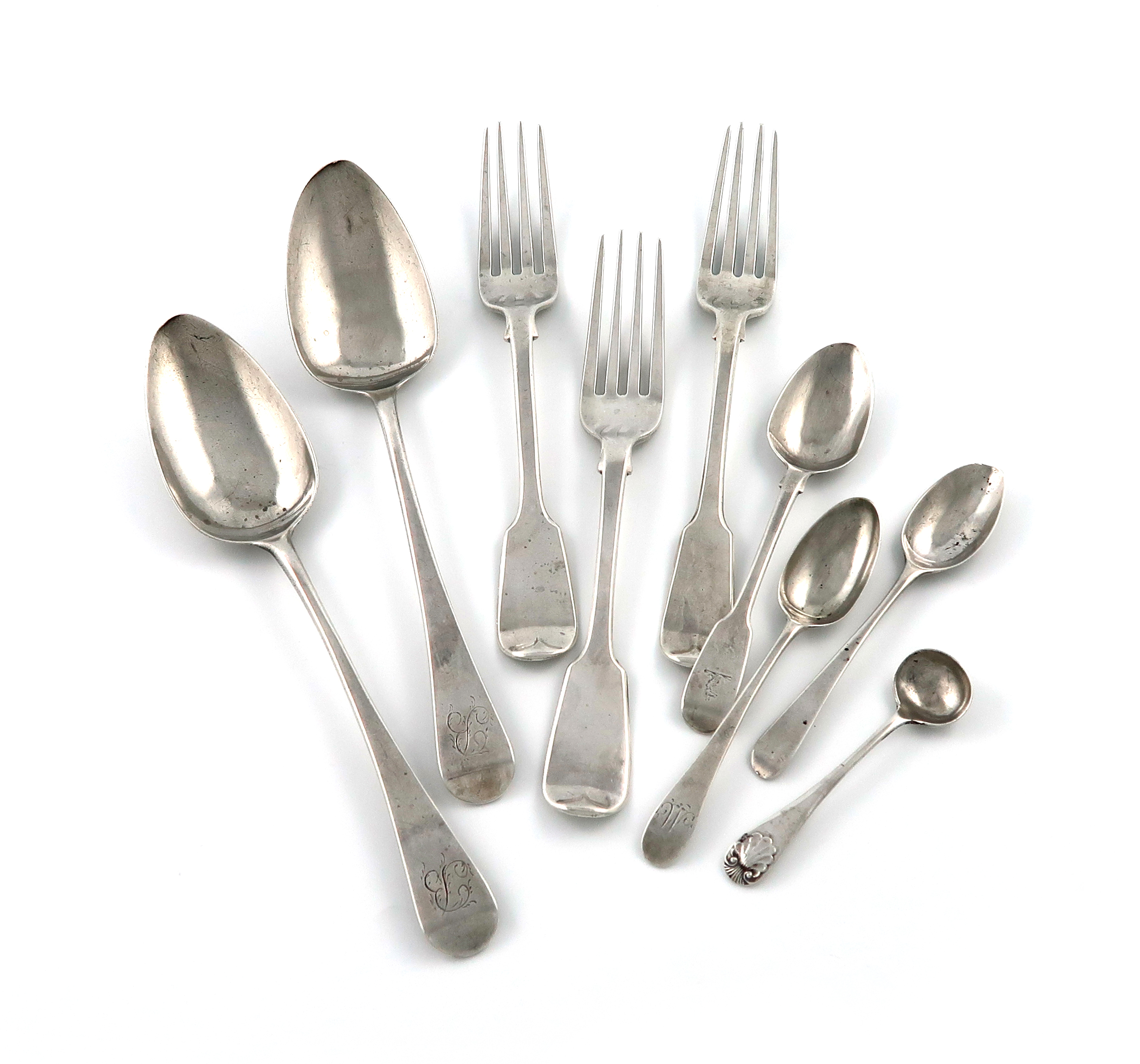 comprising: three Fiddle pattern table forks, by William Chawner, London 1824/26, two Old English pattern tablespoons, three teaspoons, and an Old English Shell pattern salt spoon, approx. weight 12.5oz. (9)