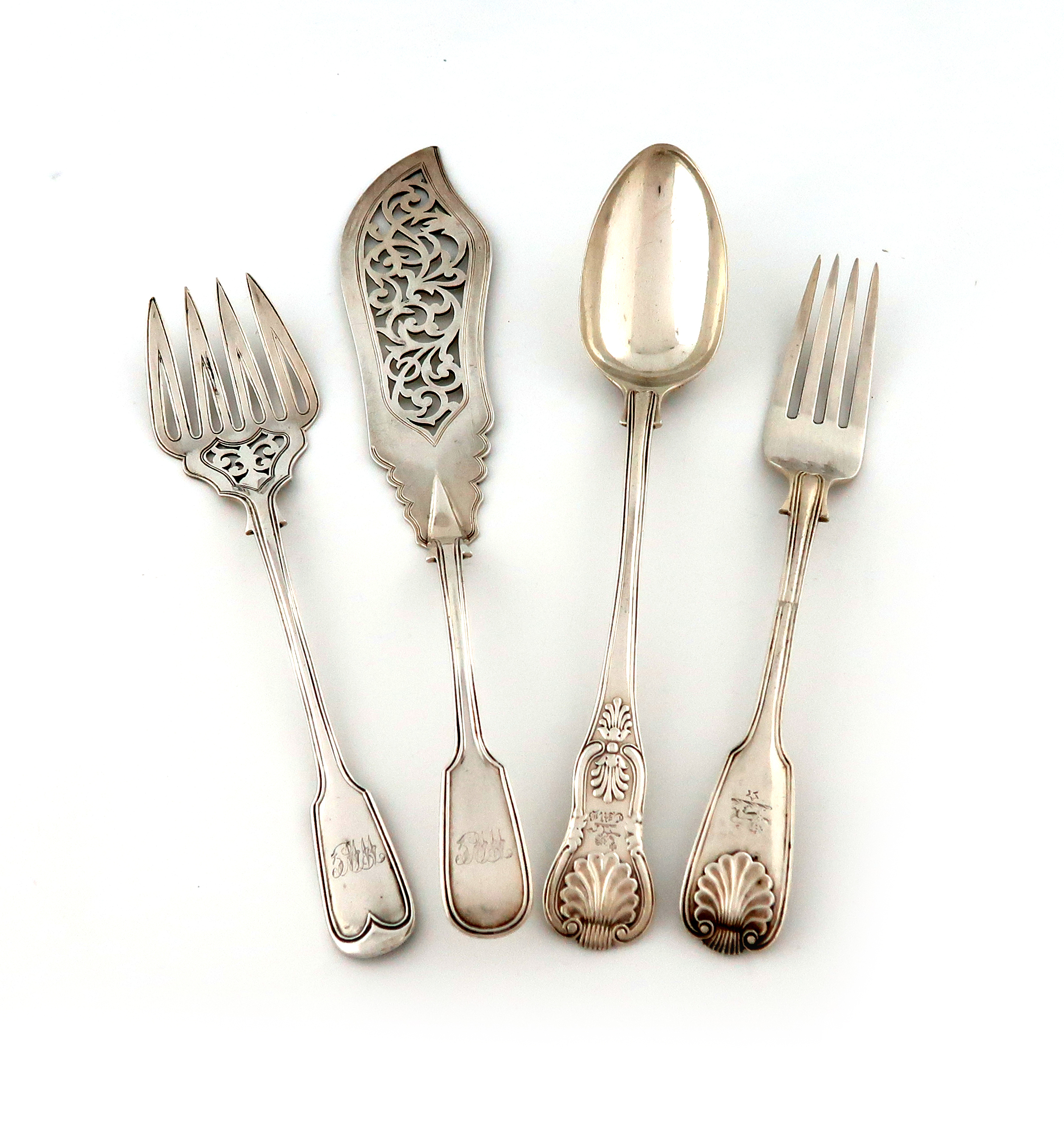 the terminals initialled, plus a large Fiddle, Thread and Shell pattern serving fork, by George Adams, London 1848, and a King's pattern basting spoon, London 1827, approx. weight 22oz. (4)