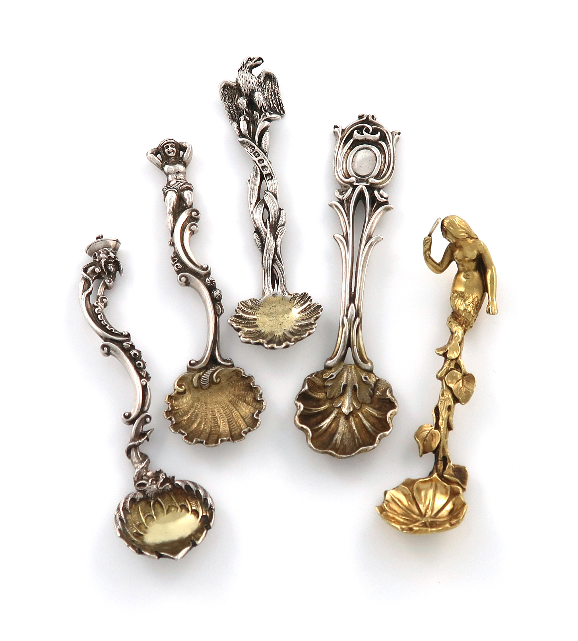 comprising: a silver-gilt one by Charles Edington, London 1851, the bowl of flower-head form, the handle cast with a mermaid holding a mirror, length 9cm, plus one by Elkington and Co., Birmingham 1843, the terminal cast with an eagle, pierced bull rush stem with a shell bowl, two cast figural spoons, by Rawlings and Summers, London 1845, with a Chinese head and one with a semi-nude female figure, plus one with pierced decoration, approx. weight 4.1oz. (5)