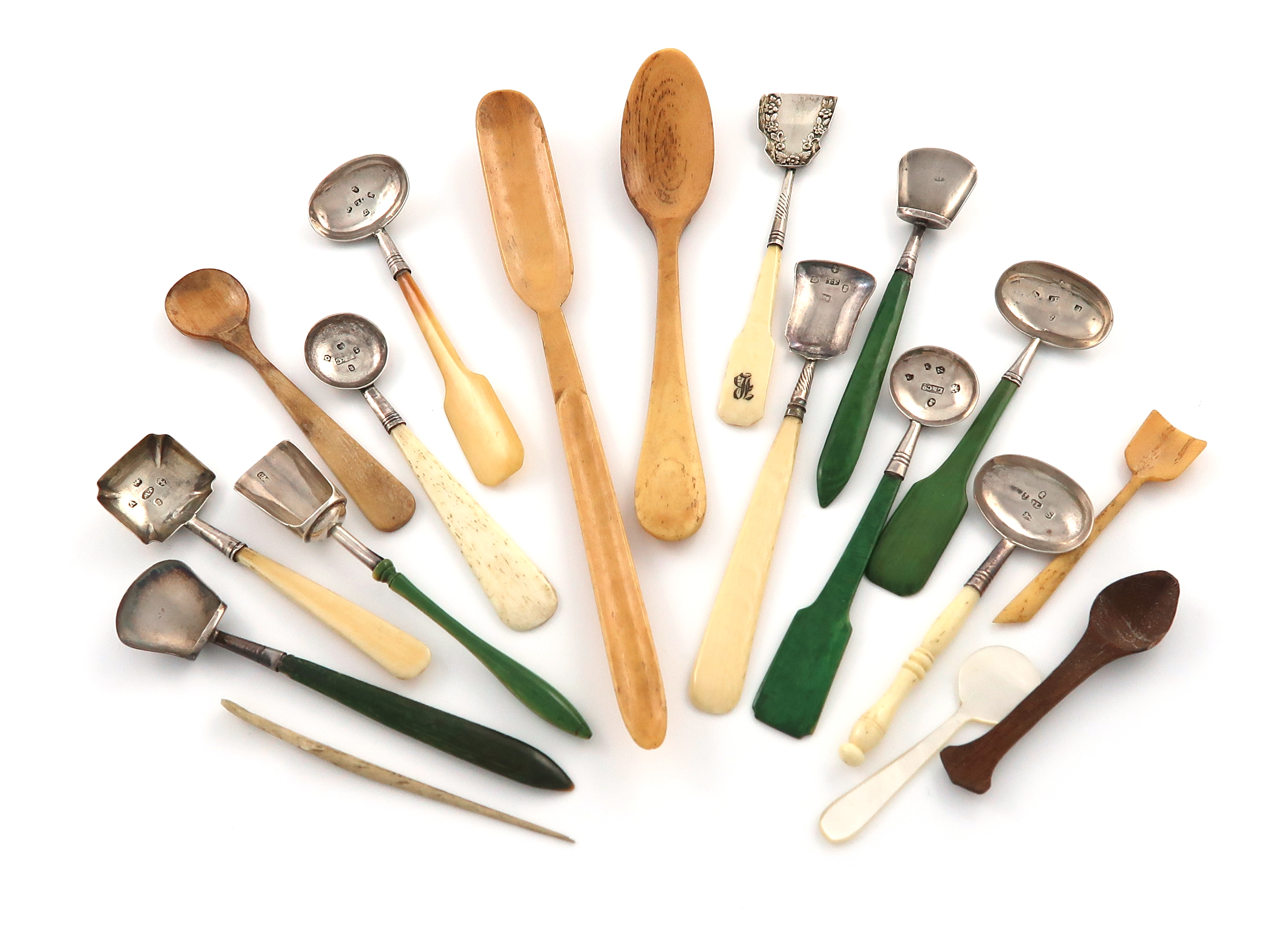 various designs, including some green stained, plus other examples and some bone handled salt spoons. (qty)