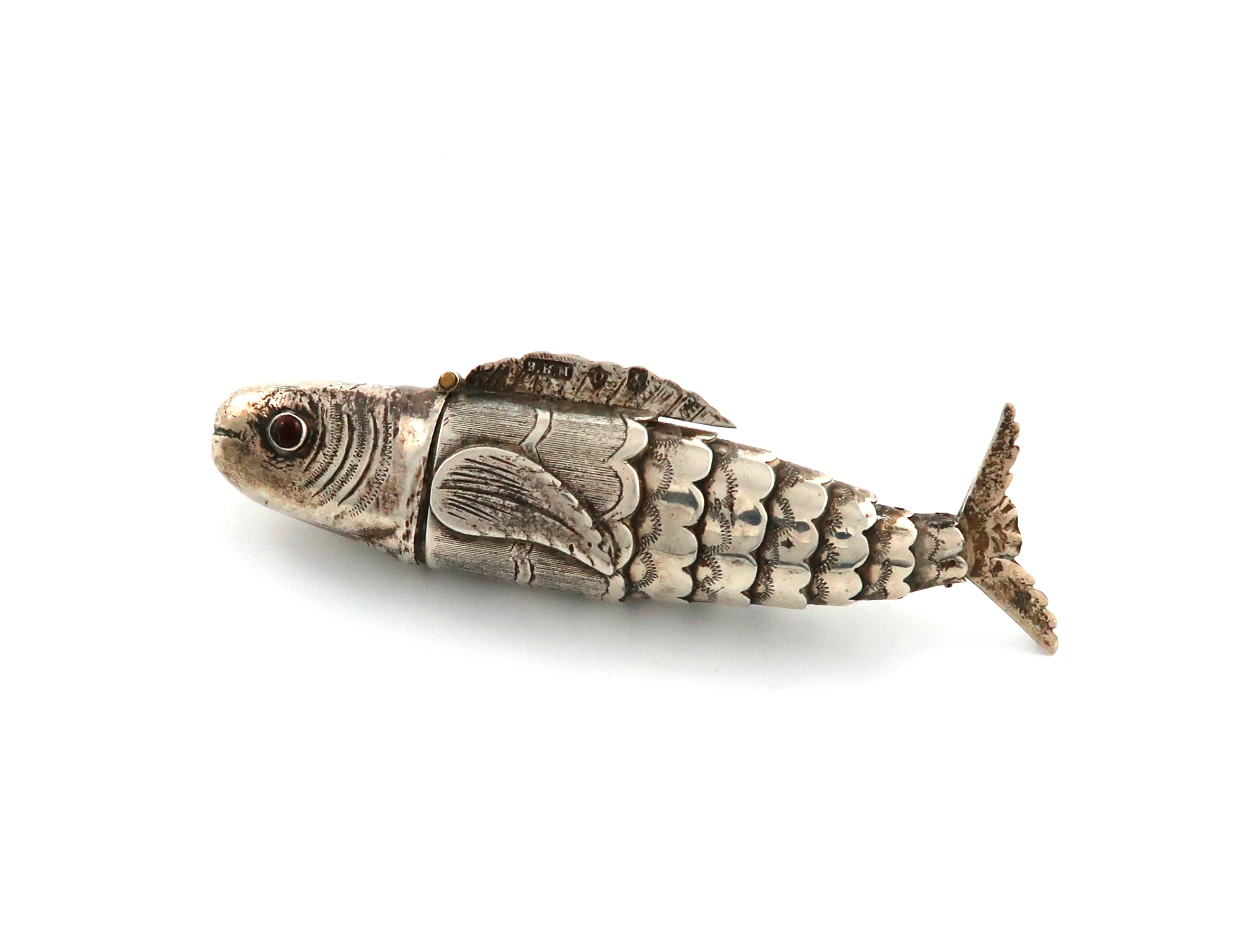 by Neresheimer of Hanau, with import marks for Berthold Muller, London 1912, the hinged head set with red eyes, engraved fish scale decoration, length 10.5cm, approx. weight 1.1oz.