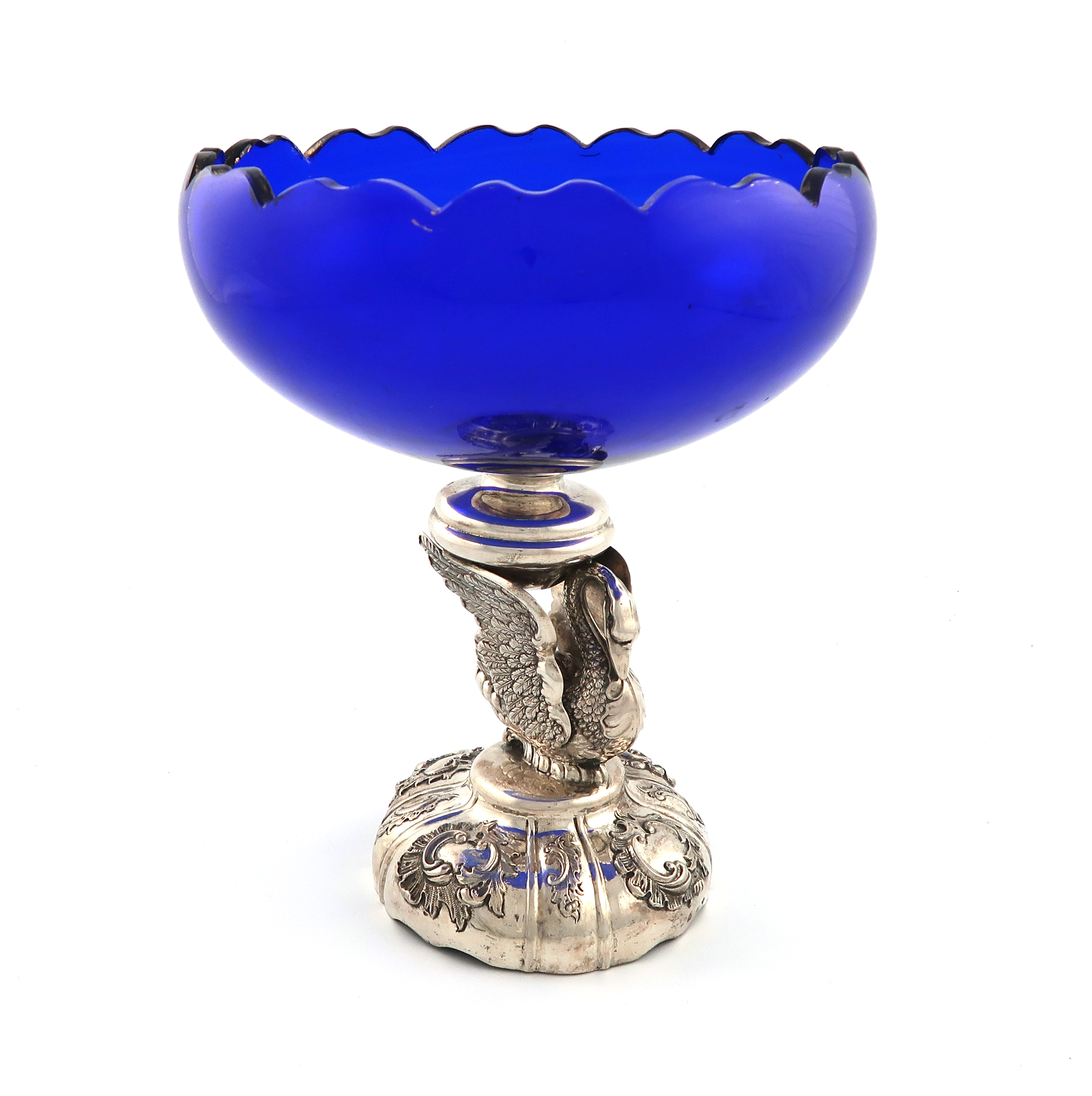 the circular bowl with a wavy-edge border, supported by a stem modelled as a swan, on a raised circular base with foliate scroll decoration, height 25.5cm.
