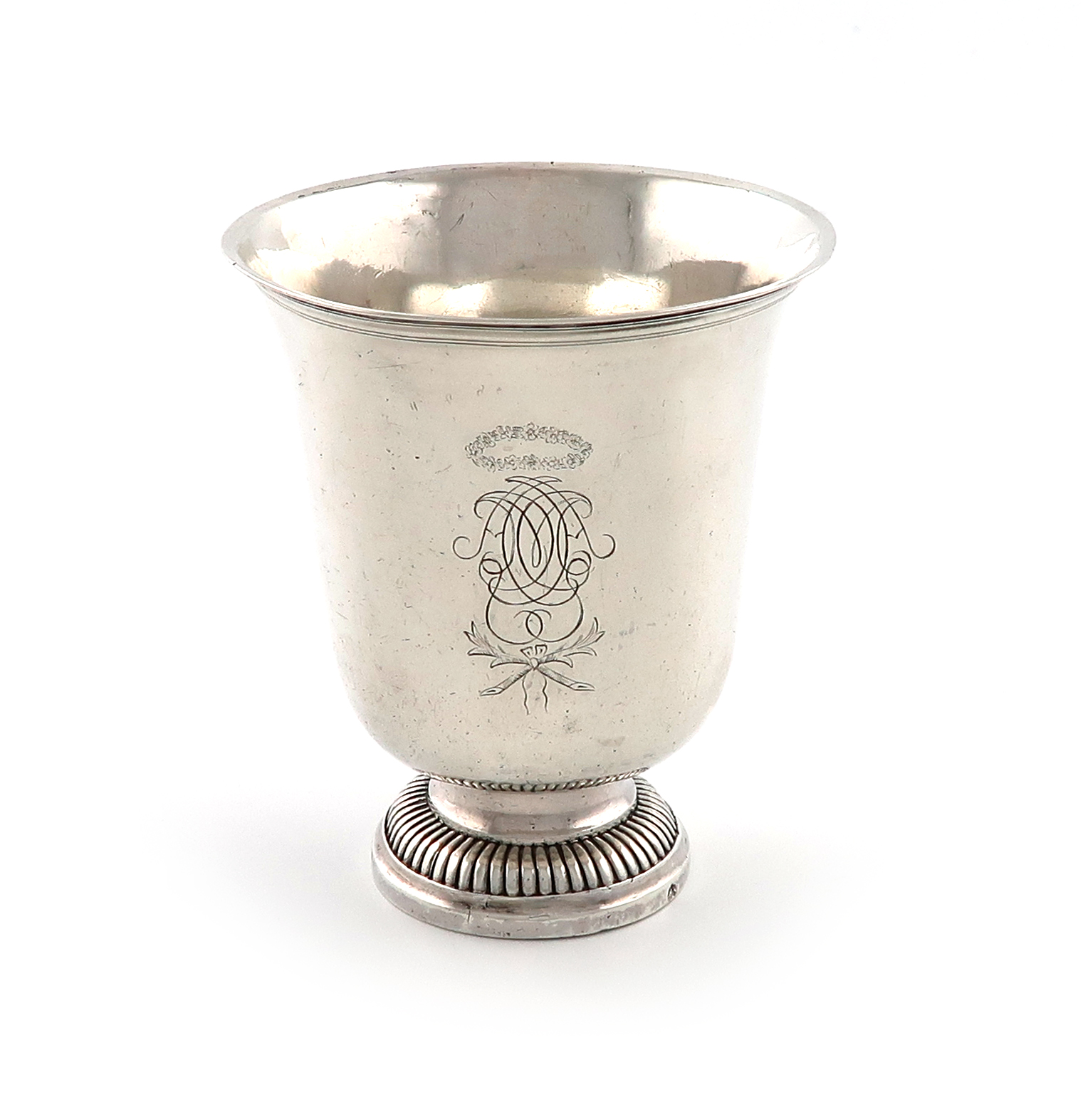 tapering circular form, engraved with initials, on a raised fluted circular foot, height 11.2cm, approx. weight 6.5oz.