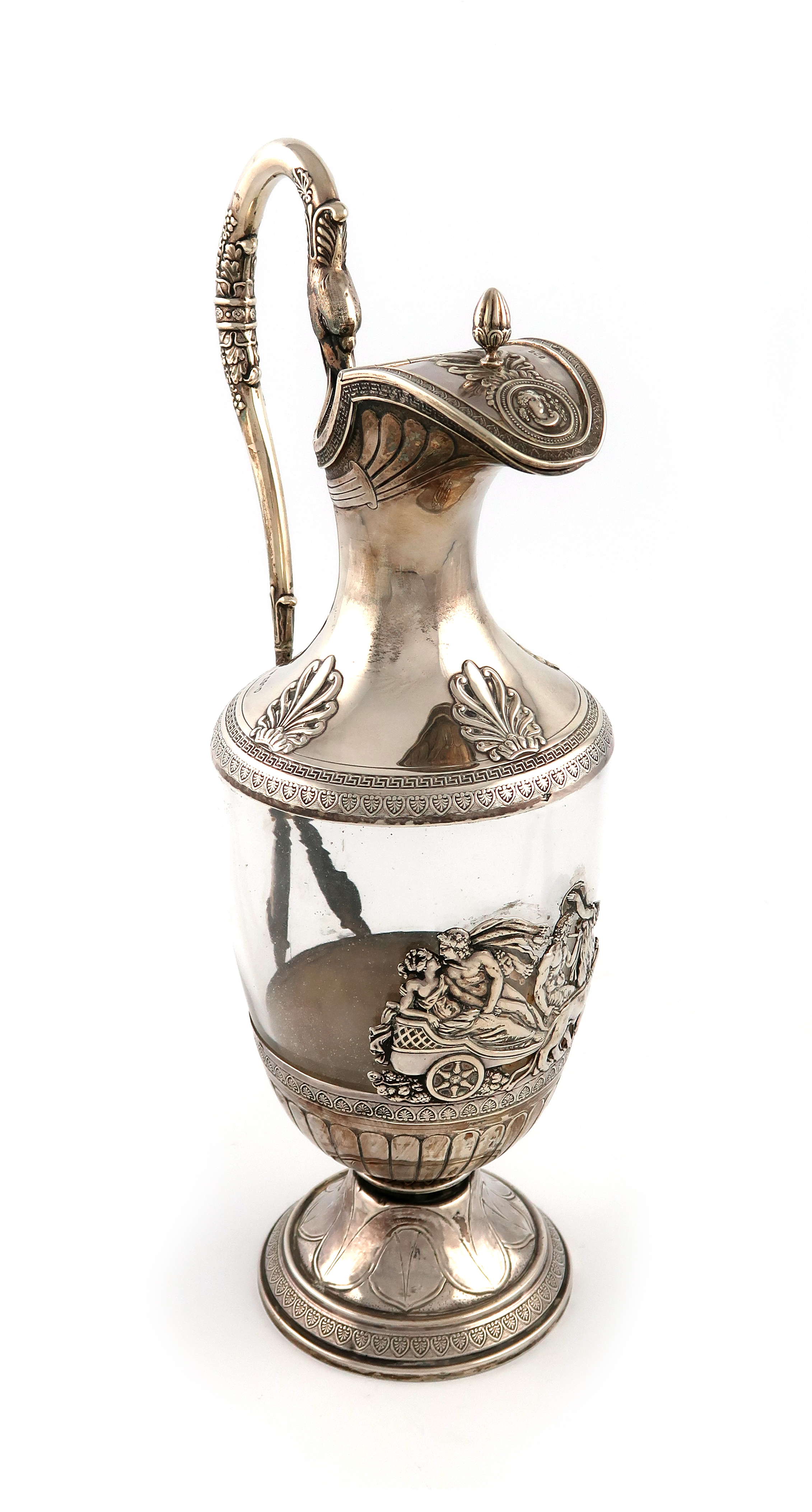 in the classical manner, vase form, the scroll handle with a swan motif, hinged cover, the front applied with a chariot scene, above fluted decoration, on a circular foot, glass body intact, but slightly loose in mounts, height 34.8cm.