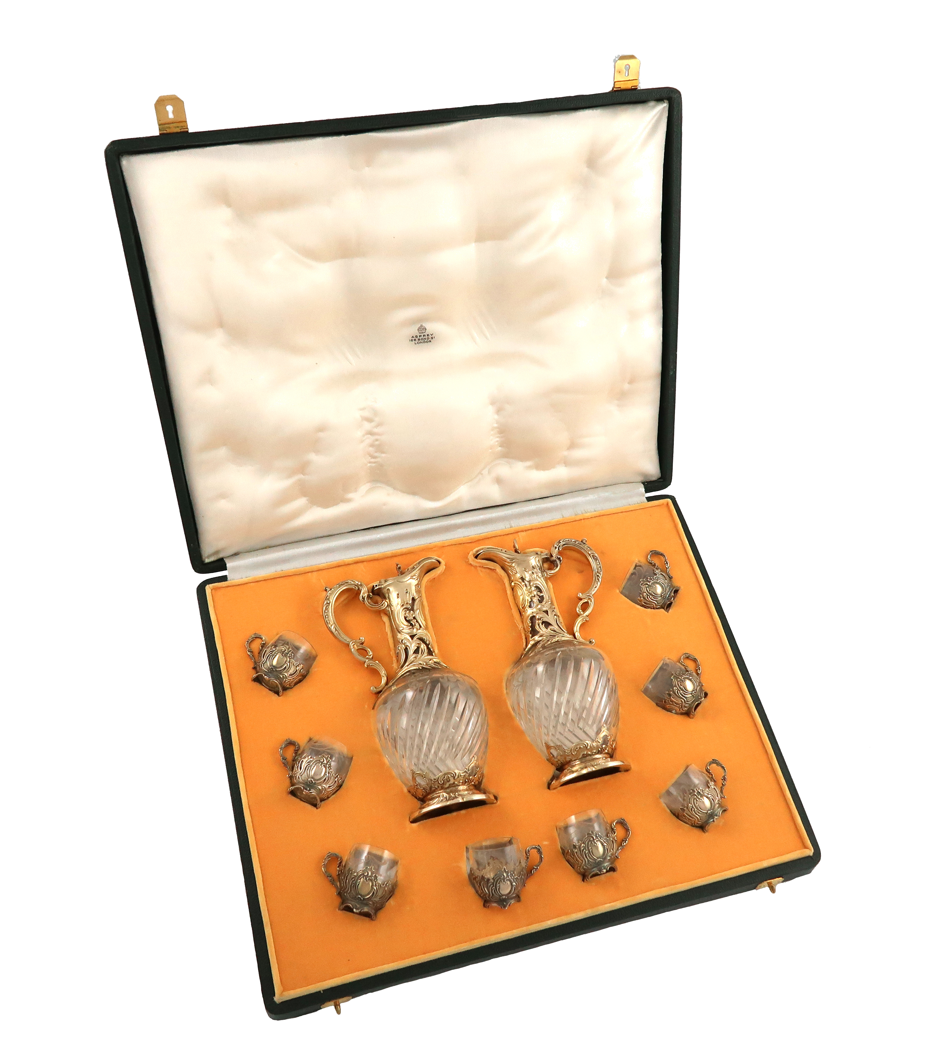 comprising: a pair of jugs with pierced foliate mounts, scroll handles, fluted and engraved baluster bodies, on shaped circular bases, hinged covers, initialled, and eight tot cups, with scroll handles, in a fitted case, height of jug 21cm.