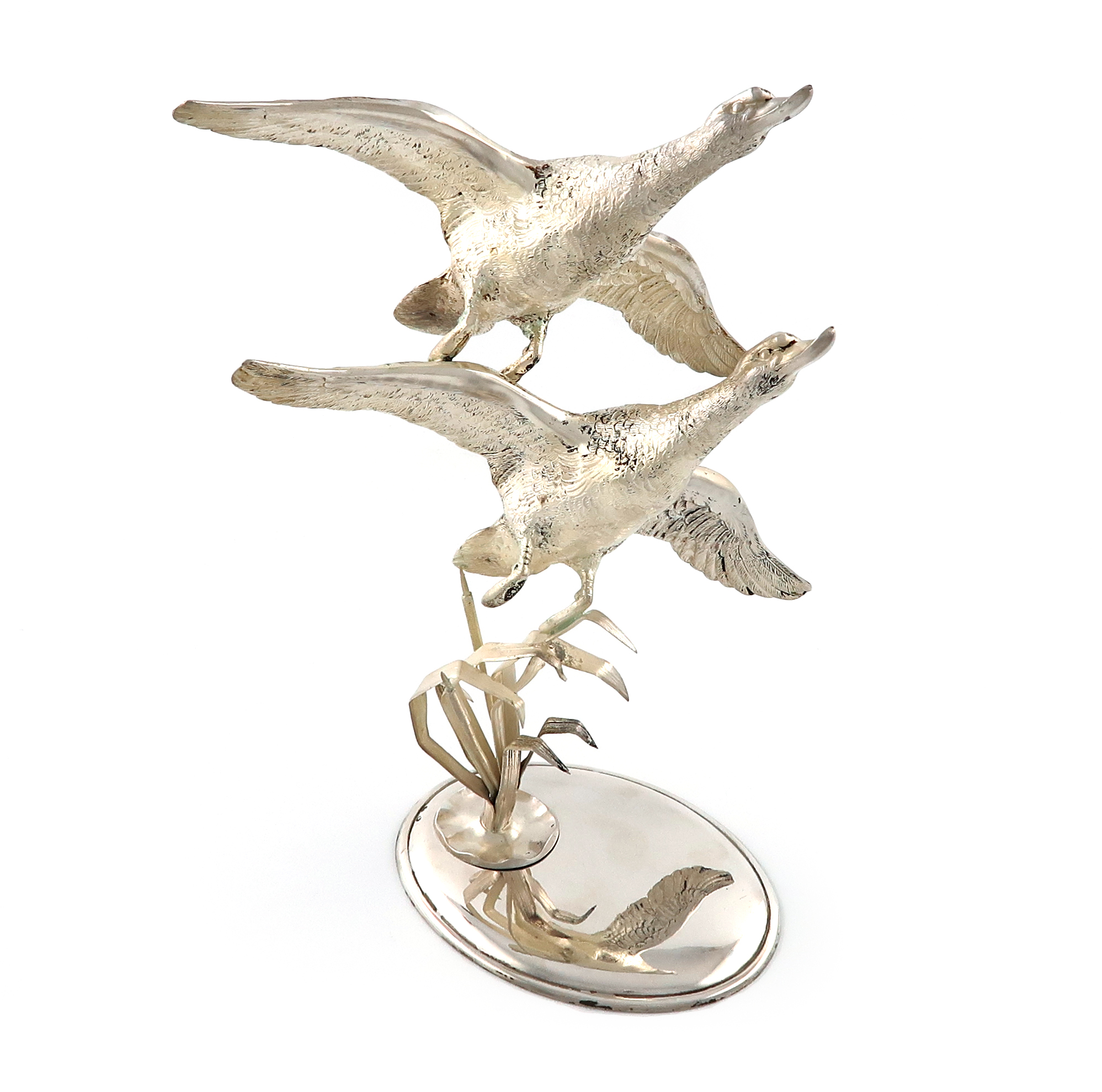 A modern Spanish silver model of two ducks in flight
