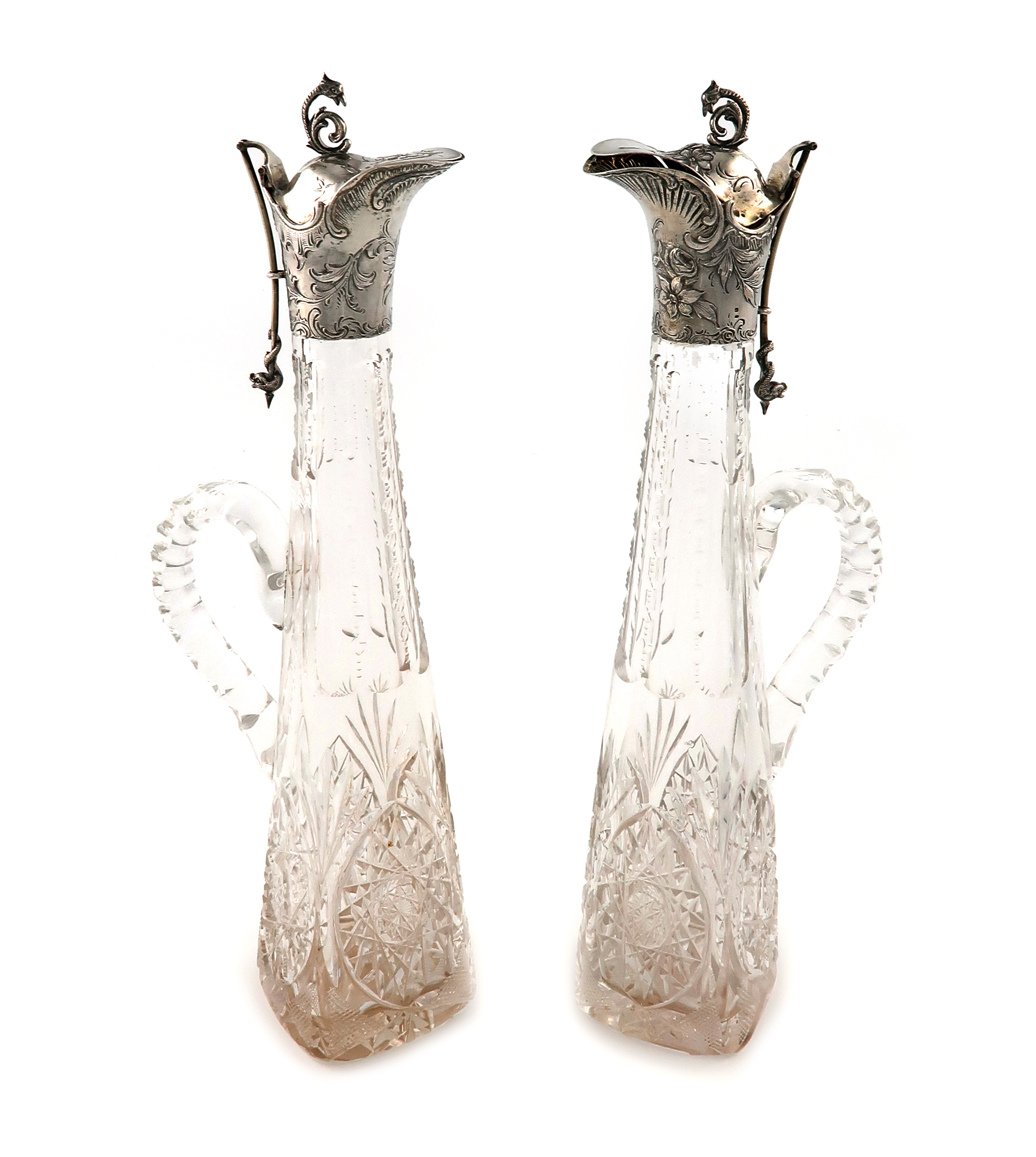 tapering rounded square form, cut glass decoration, scroll handles, the mounts with foliate scroll decoration, the hinged covers with a scroll finial and with an opening mechanism with a mythical dolphin, height 33cm. (2)