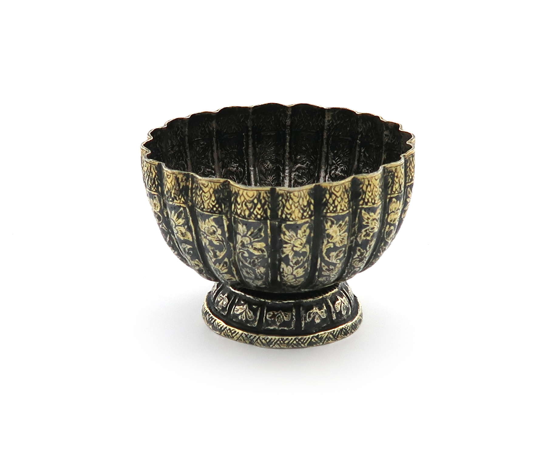fluted circular form, with foliate niello work decoration, on a circular base, filled, diameter 7.2cm.