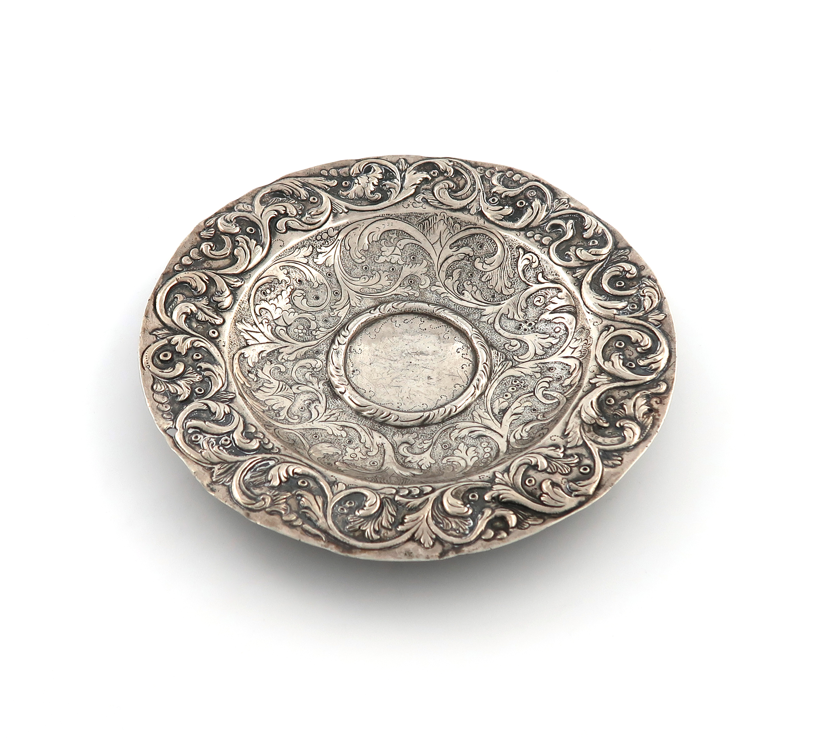 circular form, embossed and chased foliate scroll decoration, diameter 20.5cm, approx. weight 6oz.