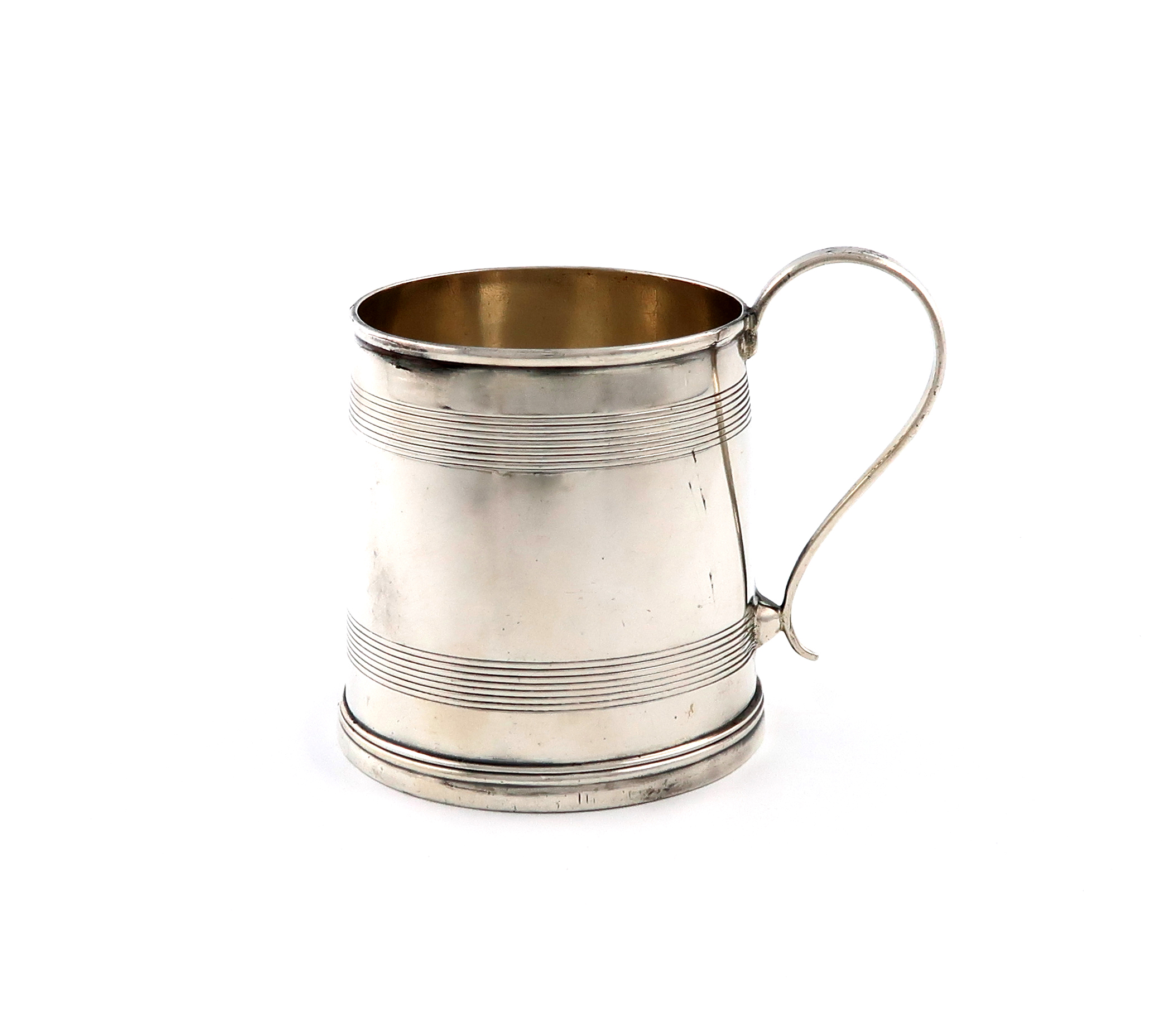tapering circular form, scroll handle, with an upper and lower band of reeded decoration, height 8.8cm, approx. weight 5.5oz.