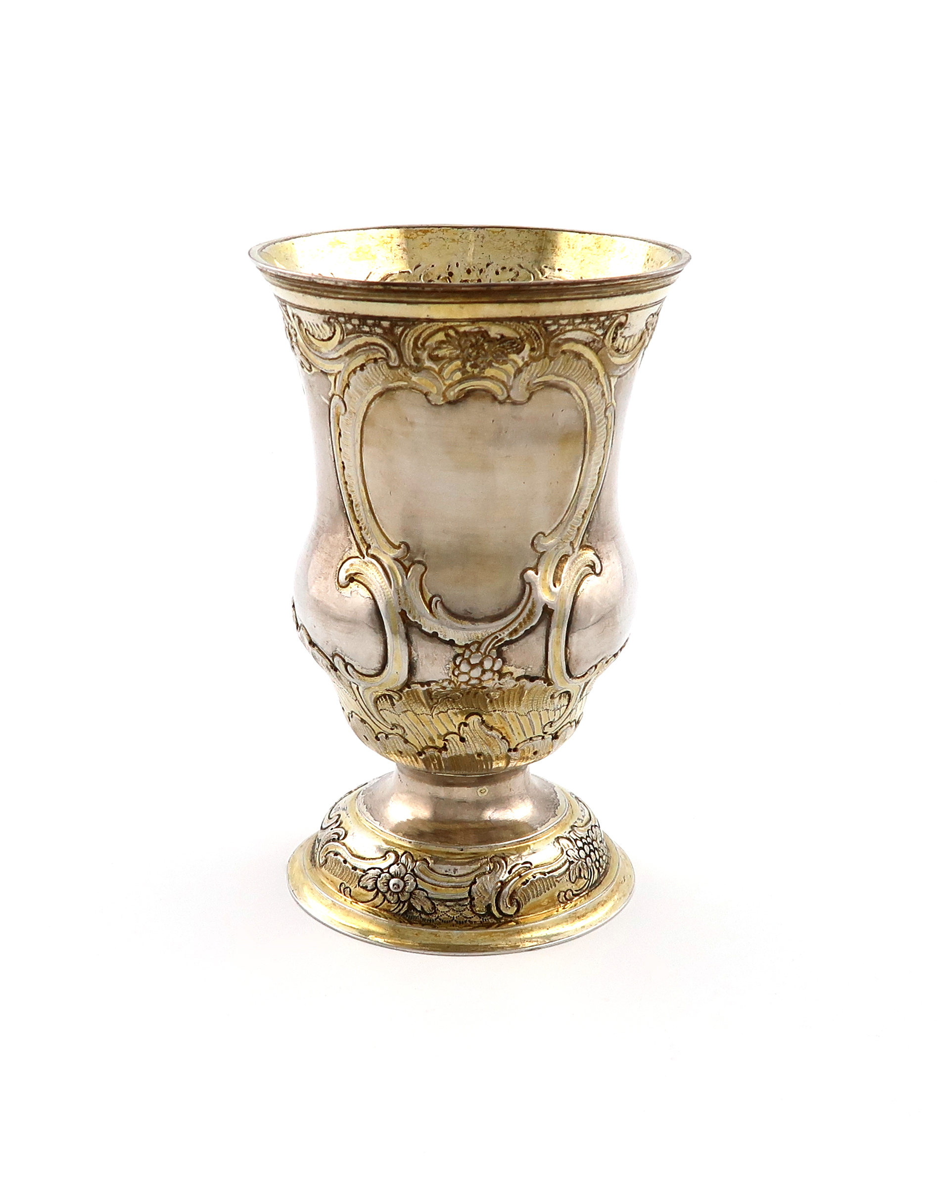tapering and baluster form, embossed foliate scroll decoration, on a raised circular foot with foliate scroll decoration, height 14.5cm, approx. weight 7.4oz.