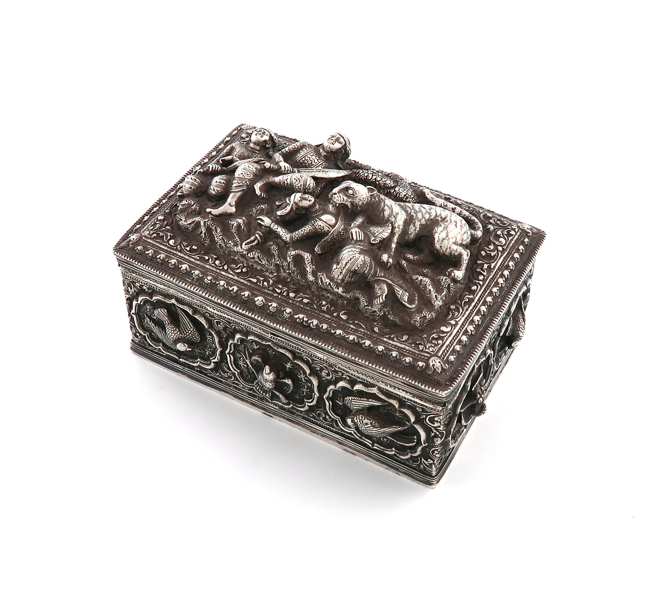 rectangular form, the sides embossed and chased with birds, the hinged cover with a scene of hunters and a big cat, possibly a tiger attacking a hunter, foliate borders, wood lined interior, length 14cm.