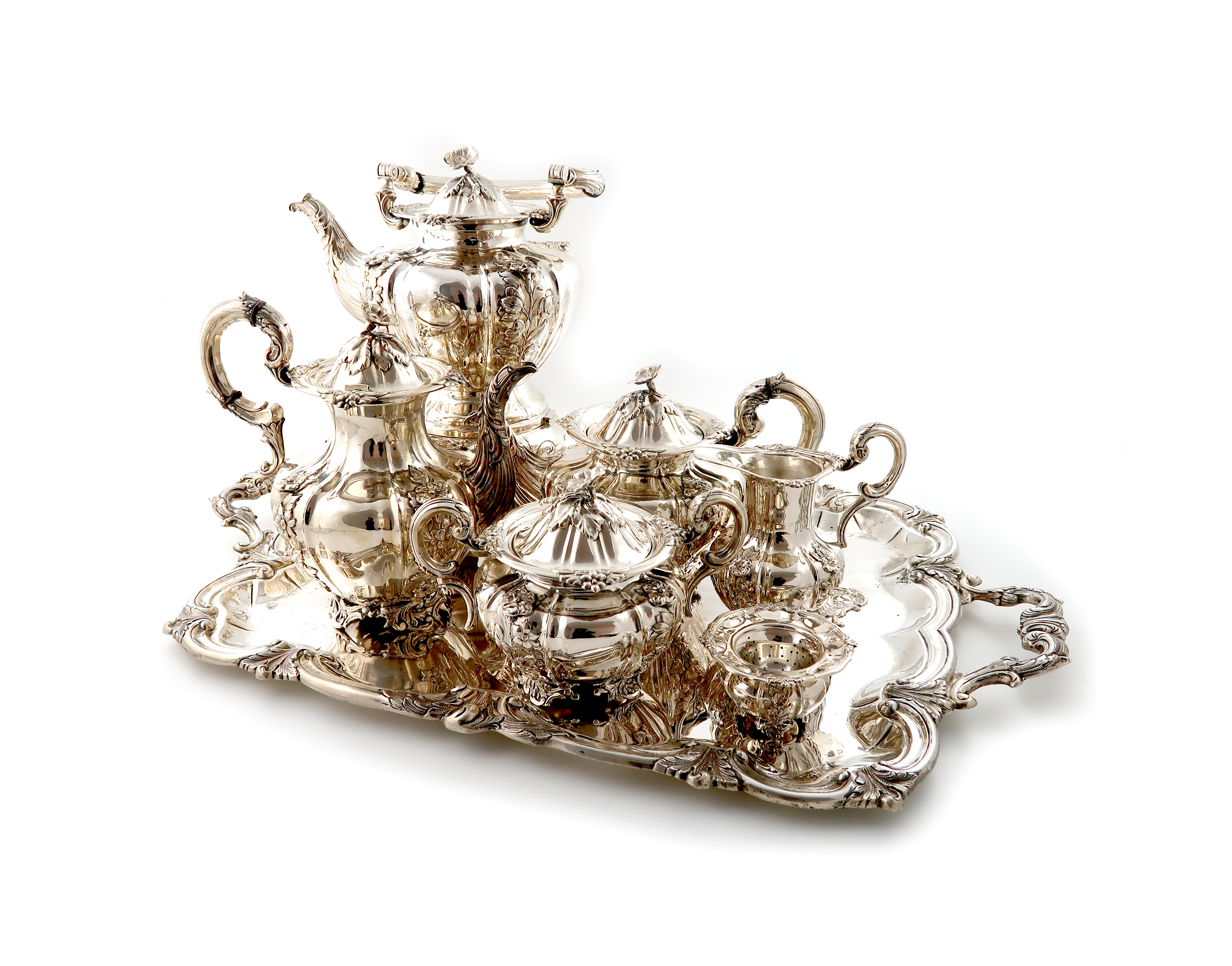 comprising: a kettle on stand, (no burner), a coffee pot, a tea pot, a cream jug, a sugar bowl and a tea strainer and stand, lobed baluster form, embossed foliate decoration, plastic simulated tortoiseshell insulators, flower finials, on pierced foliate scroll bases, the tray of shaped rectangular form, foliate scroll border, length of tray 71.5cm, height of kettle 44cm, approx. weight 232oz. (7)