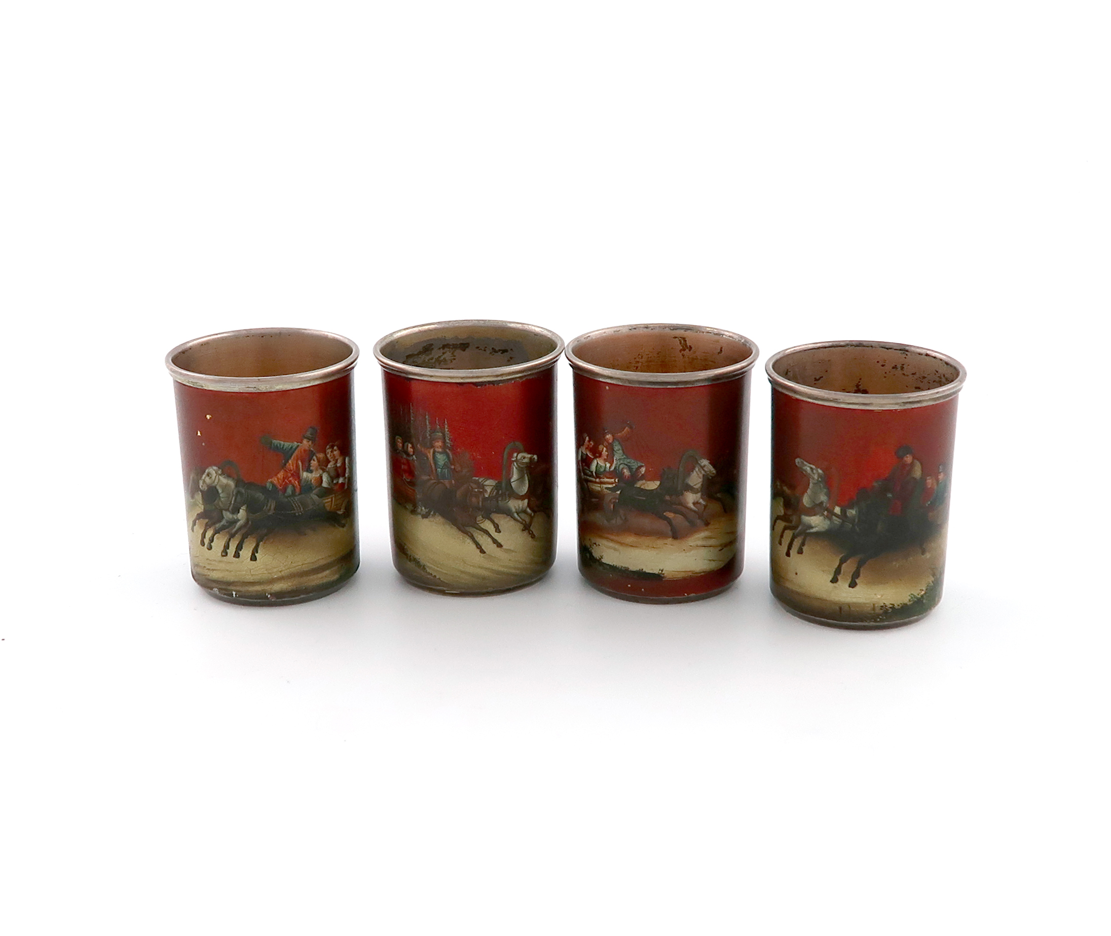 tapering circular form, each painted with a scene of a troika on a dark red ground, height 5.6cm and 5.4cm, approx. weight 6oz. (4)