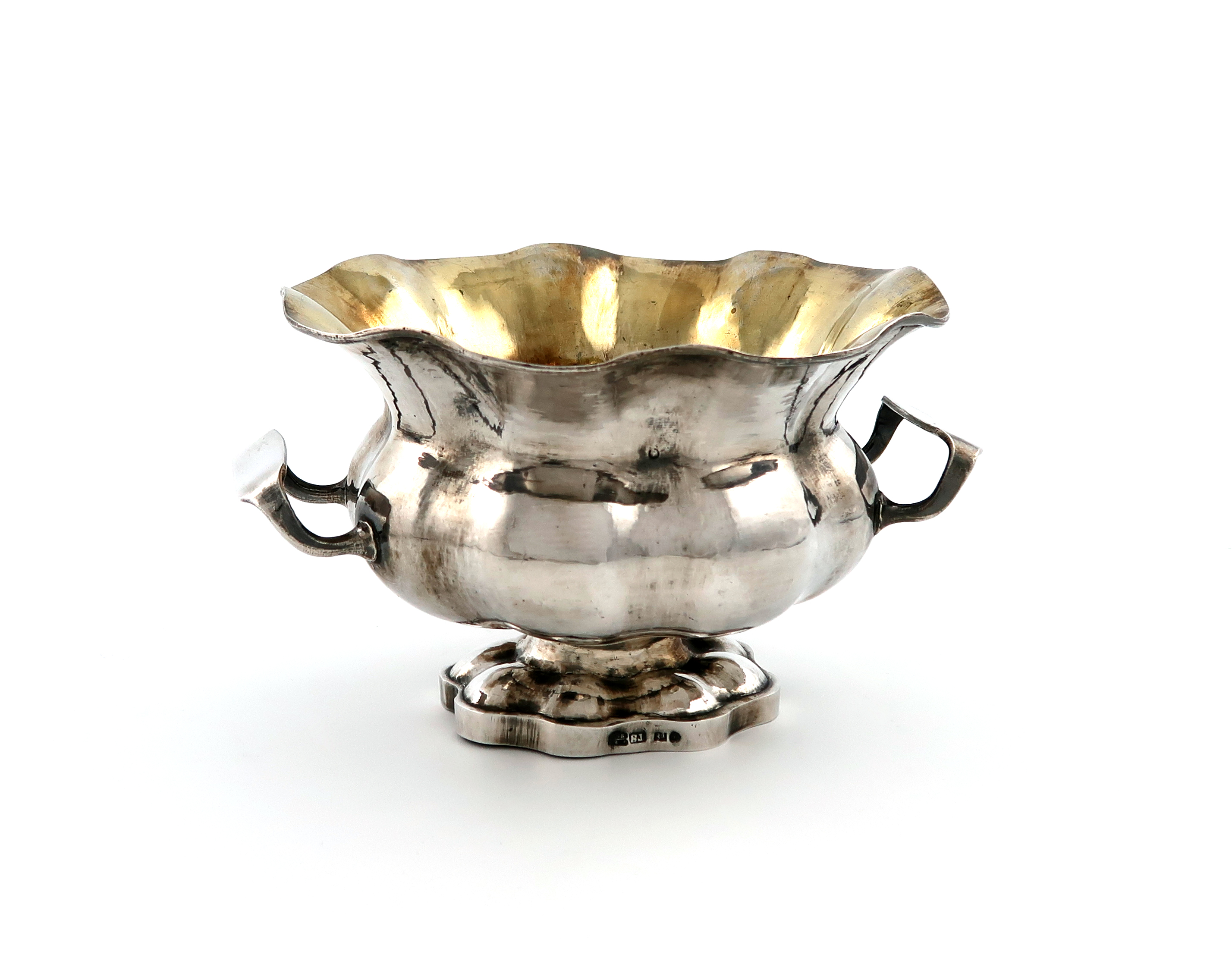 lobed oval form, plain side handles, on a shaped oval bowl, length 17cm, approx. weight 10oz.