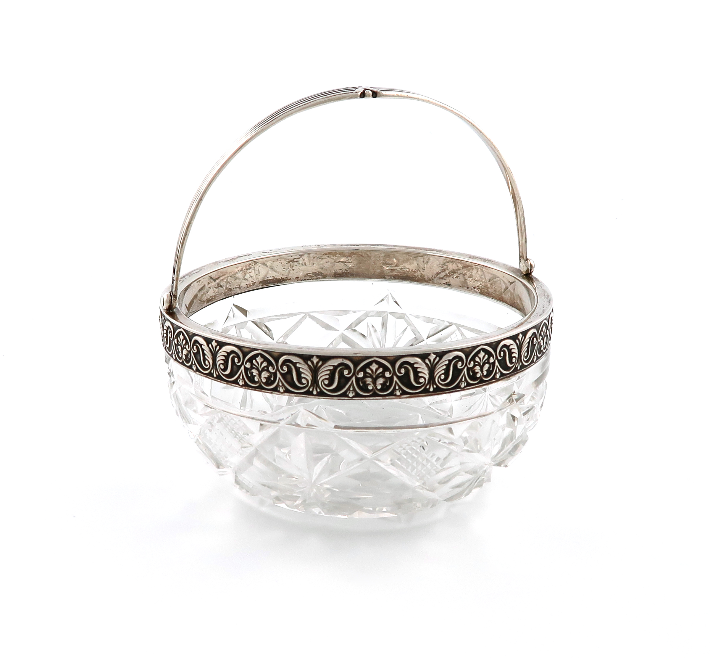 A late 19th century Russian silver-mounted swing handled glass sugar basket,