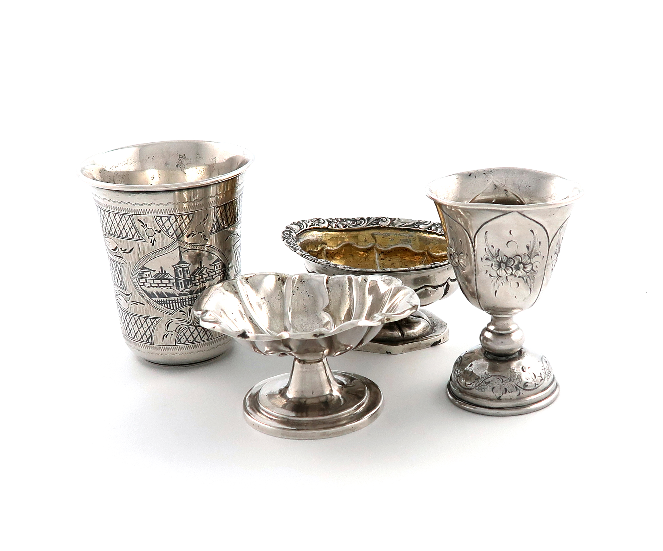 comprising: a late 19th century silver and niello work beaker, Moscow 1875, assay master unknown, tapering circular form, decorated with buildings and trellis decoration, height 7.8cm, plus a salt cellar, Tallin (Estonia) 1845, another provincial salt cellar, and a small goblet, a.f, approx. total weight 6oz. (4)