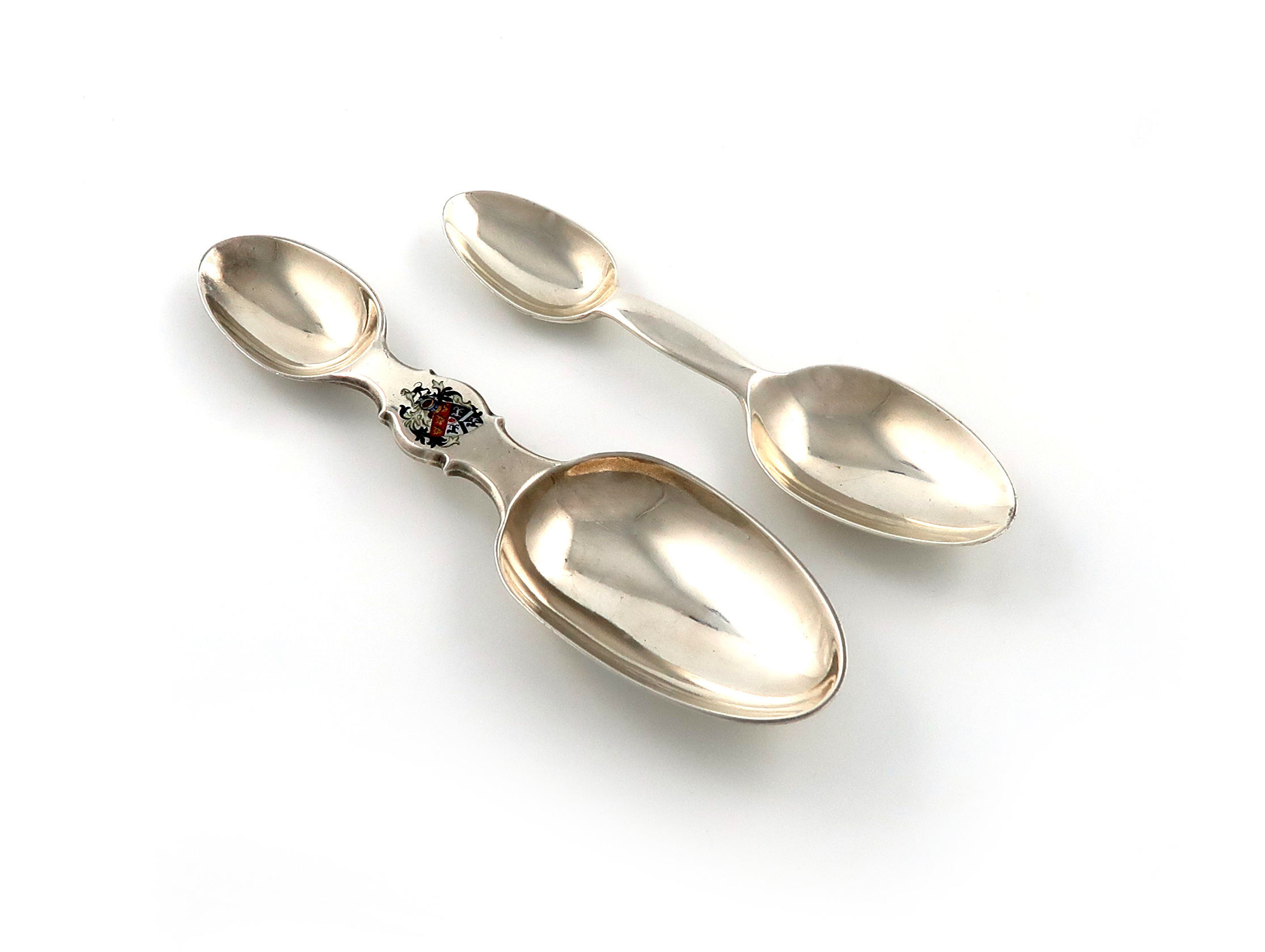 the centre section enamelled with the coat of arms of Gooch, length 17.8cm, plus a modern silver double-ended medicine spoon, by Wakeley and Wheeler, London 1955, approx. total weight 4oz. (2)