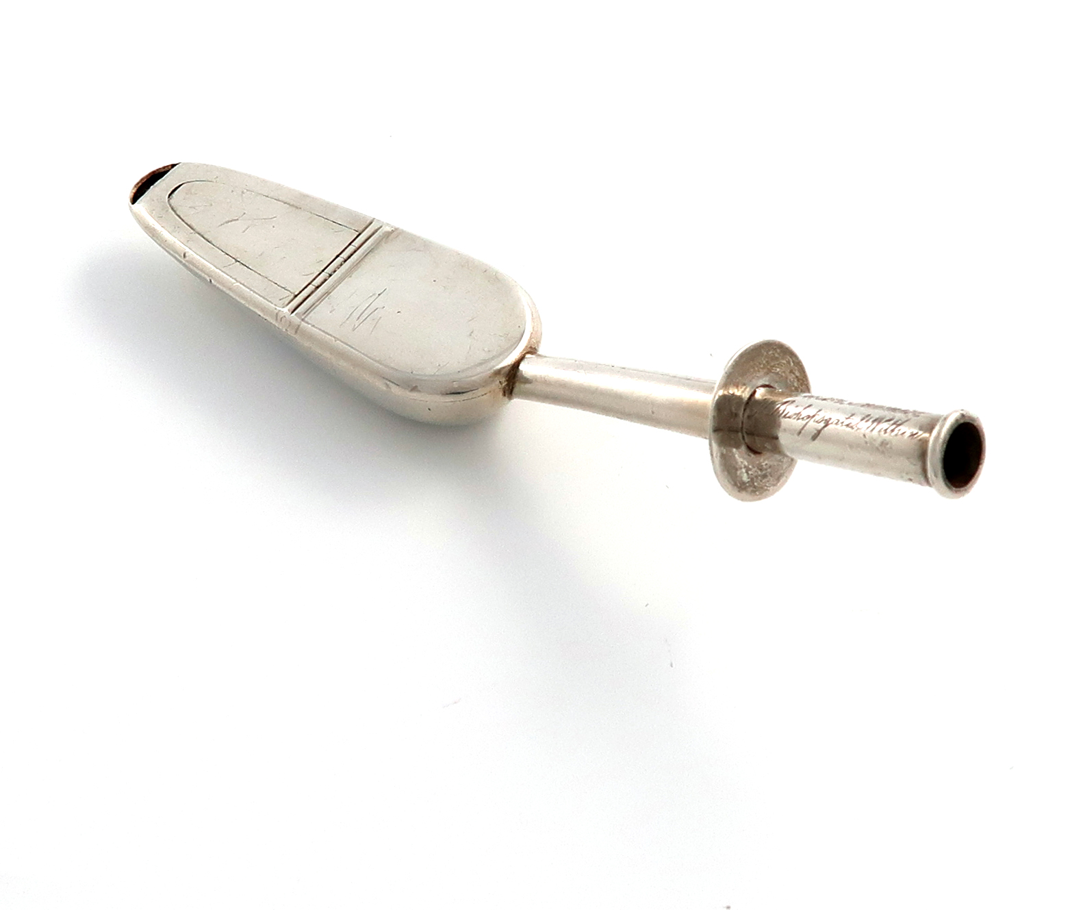 the bowl with a hinged cover, tapering handle, the end inscribed 'C. Gibson, Inventor, 71 Bishopsgate St. Within', length 13.9cm, approx. weight 1.3oz.