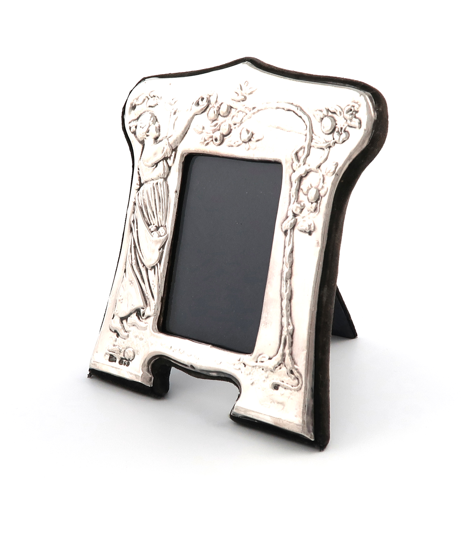shaped upright rectangular form, embossed with a lady picking apples, velvet easel back, height 15.4cm.