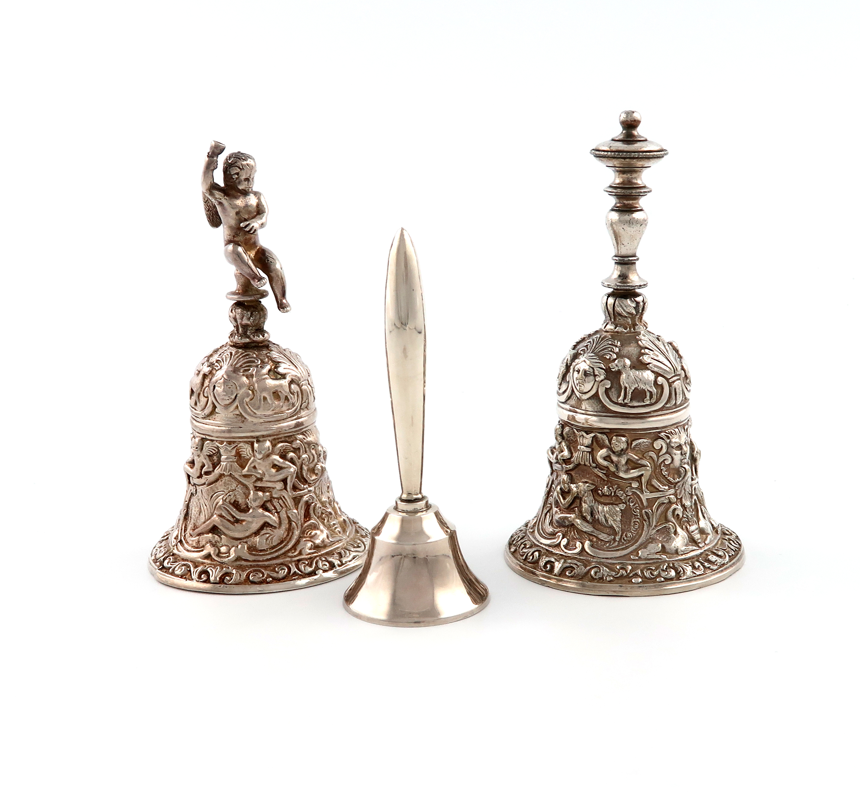 conventional form, in the Cellini manner, with a figural handle, plus another Elkington bell in the similar manner, with a baluster handle, and a silver-handled electroplated bell. (3)