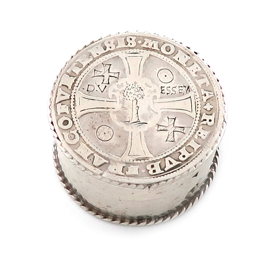circular form, the pull-off cover set with a coin, rope-work borders, diameter 3.5cm, approx. weight 0.9oz.