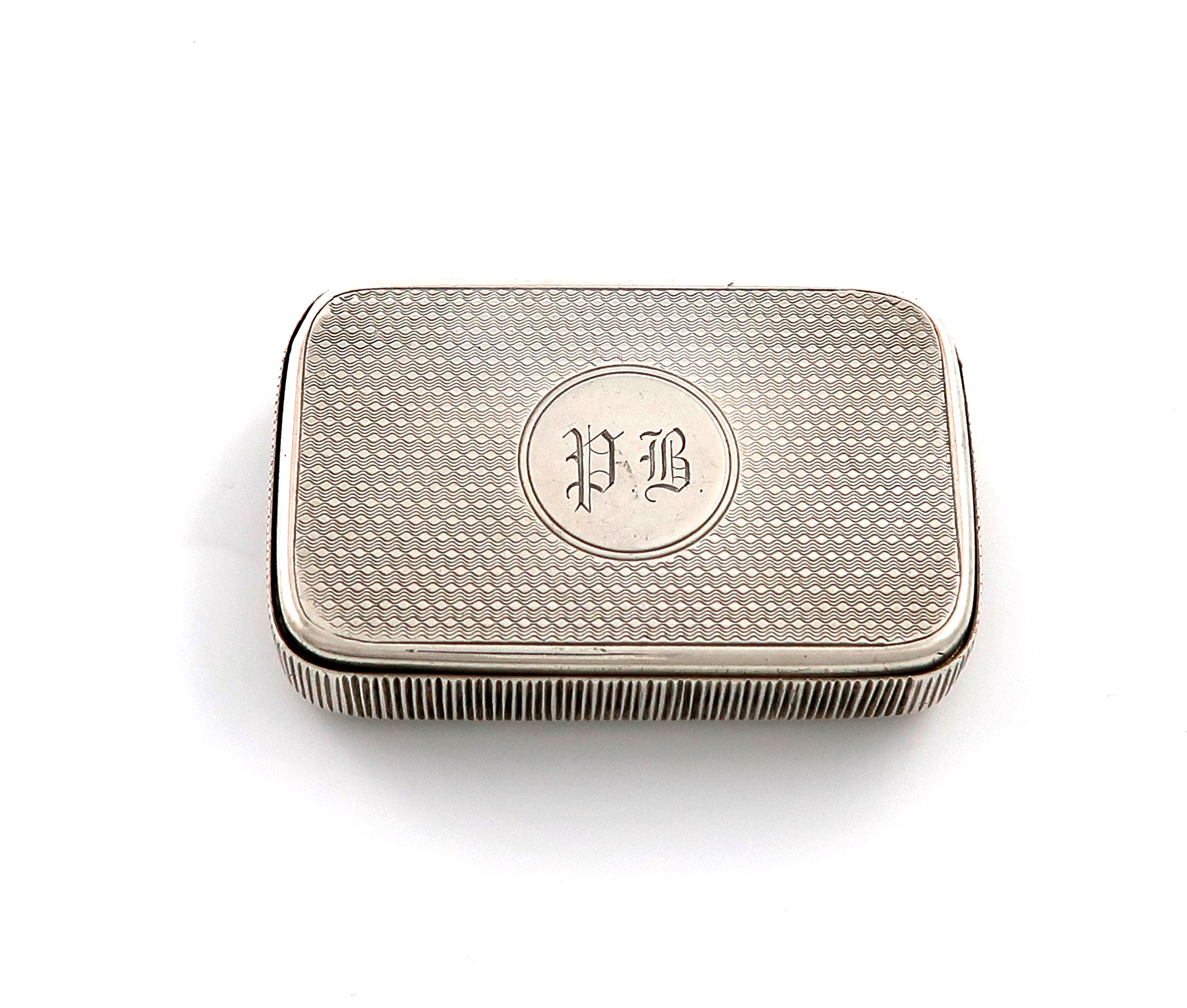 rounded rectangular form, engine-turned decoration, the cover initialled, the side with a striker, length 6.2cm, approx. weight 1.7oz.
