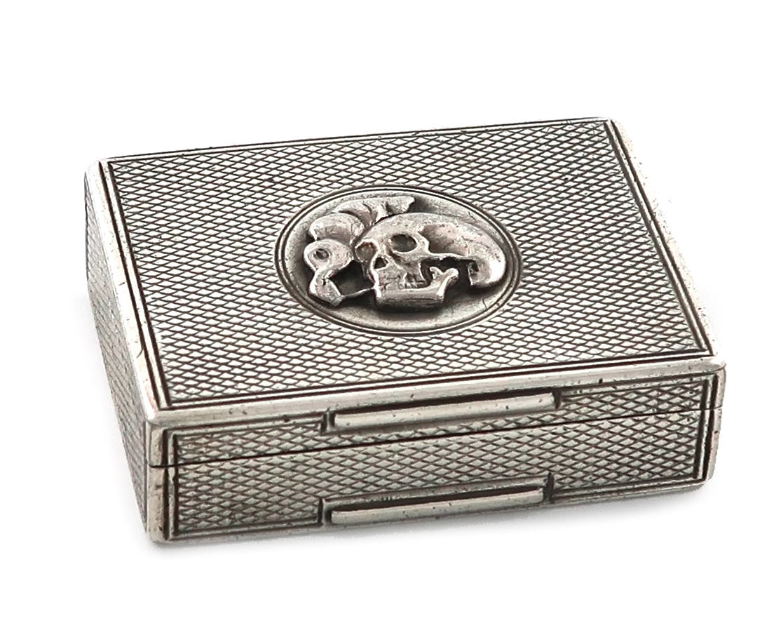 rectangular form, engine-turned decoration, the hinged cover with a skull smoking a pipe, the underside initialled, length 4.4cm, approx. weight 1.2oz.