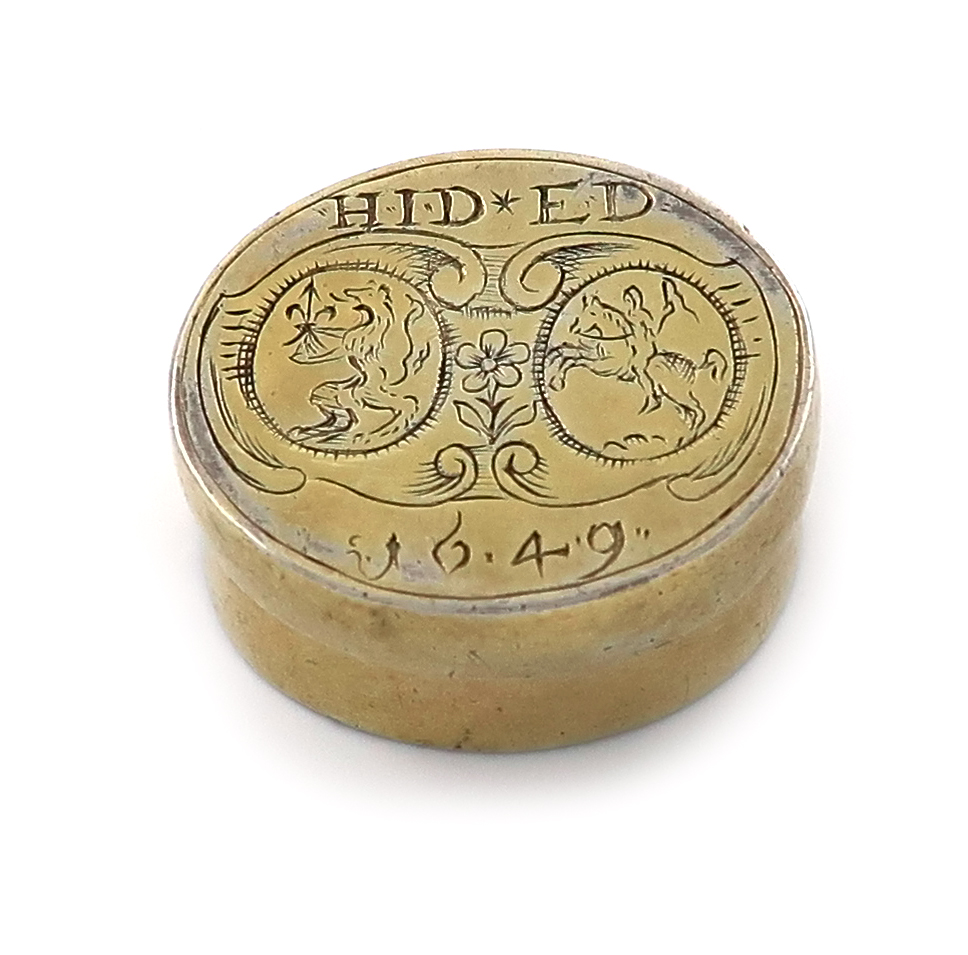 oval form, the pull-off cover engraved with a rampant lion and a horse and ride, and inscribed 'H.I.D*E.D', and '1649', the inside with three compartments, length 2.3cm, approx. weight 0.3oz.