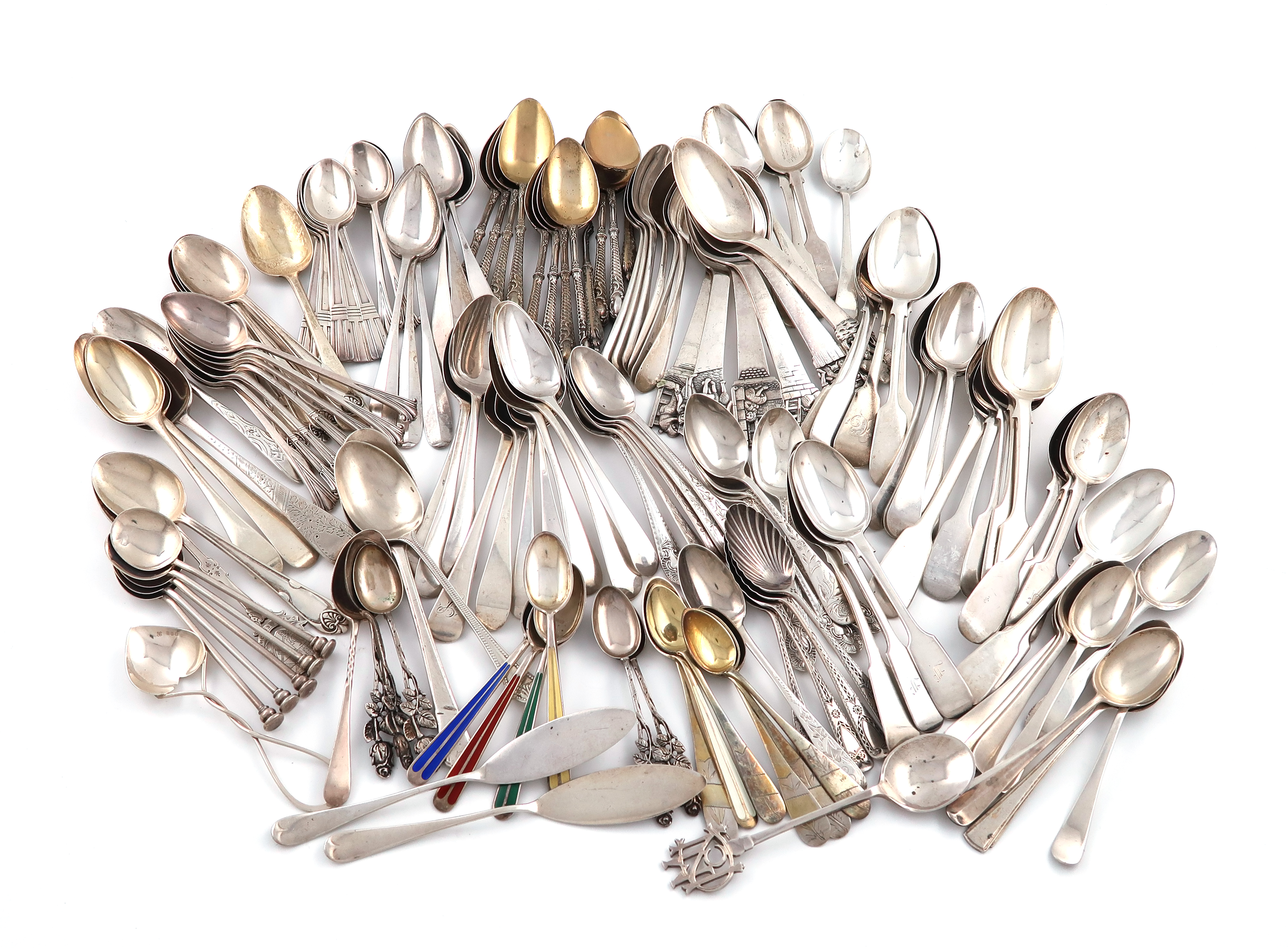 including six Danish figural spoons, a set of five Russian spoons, a set of ten French spoons, four with enamelled decoration, plus various others and two butter knives, approx. weight 65oz. (qty)