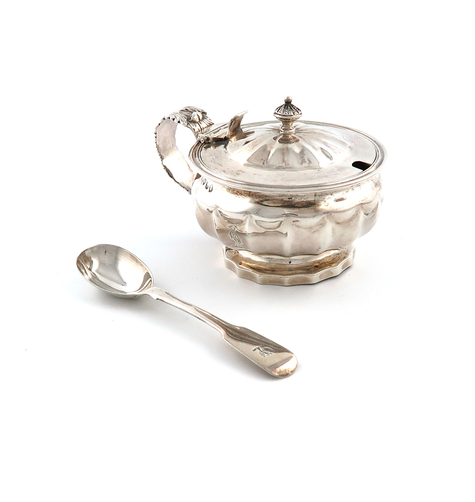 fluted circular bellied form, lead capped scroll handle, the hinged cover with a fluted finial, on a circular foot, engraved with a crest, with a clear glass liner and a later spoon, London 1833, height 7.3cm, approx. weight 5.9oz. (2)