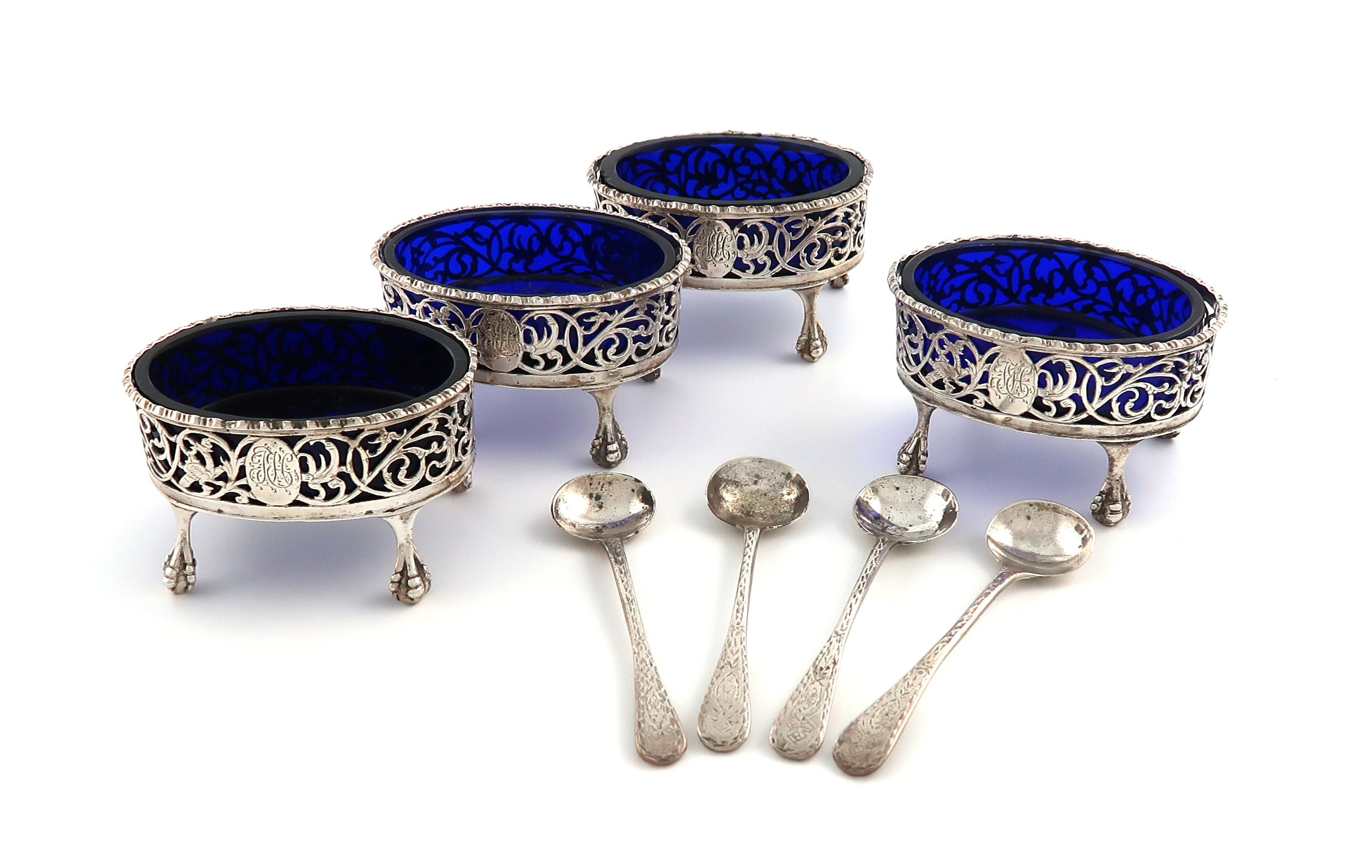oval form, pierced with foliate scroll decoration, gadroon border, on four claw and ball feet, initialled, length 8.2cm, plus four salt spoons, approx. weight 8.5oz. (8)
