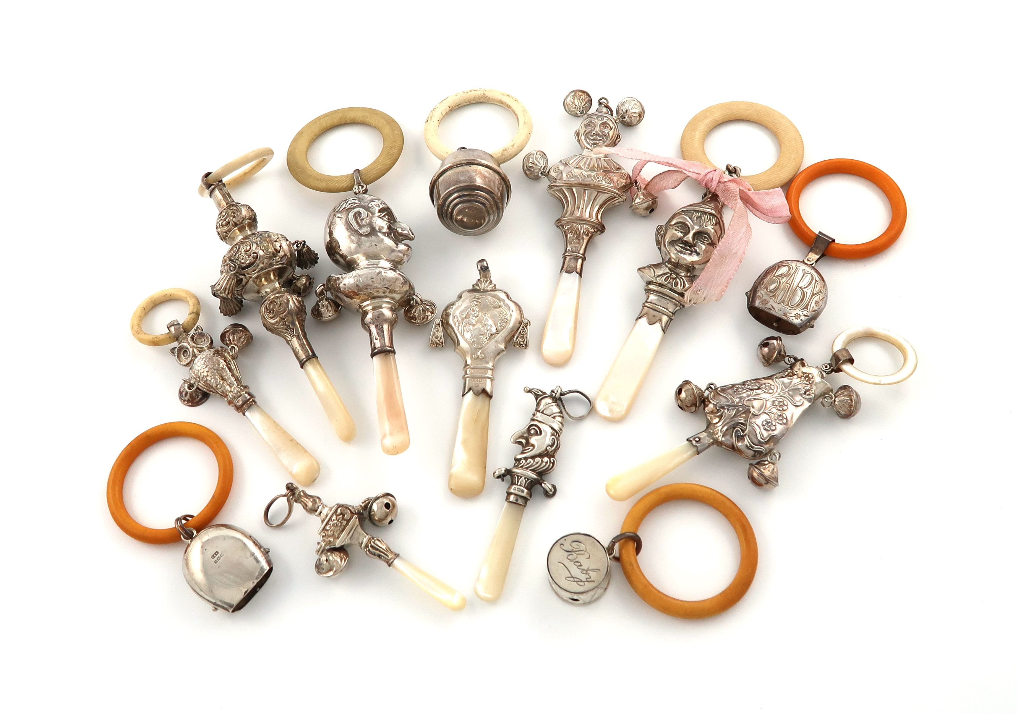 with mother-of-pearl handles and teethers and some with plastic teethers, comprising: two modelled as Mr Punch, one by Crisford and Norris, Birmingham date letter worn, the other Birmingham 1921, one modelled as an owl, by Crisford and Norris, Birmingham 1914, a late Victorian one of baluster form, Birmingham 1900, one as a jester, one as a pixie, two as cow bells, one as a drum, and three others. (13)
