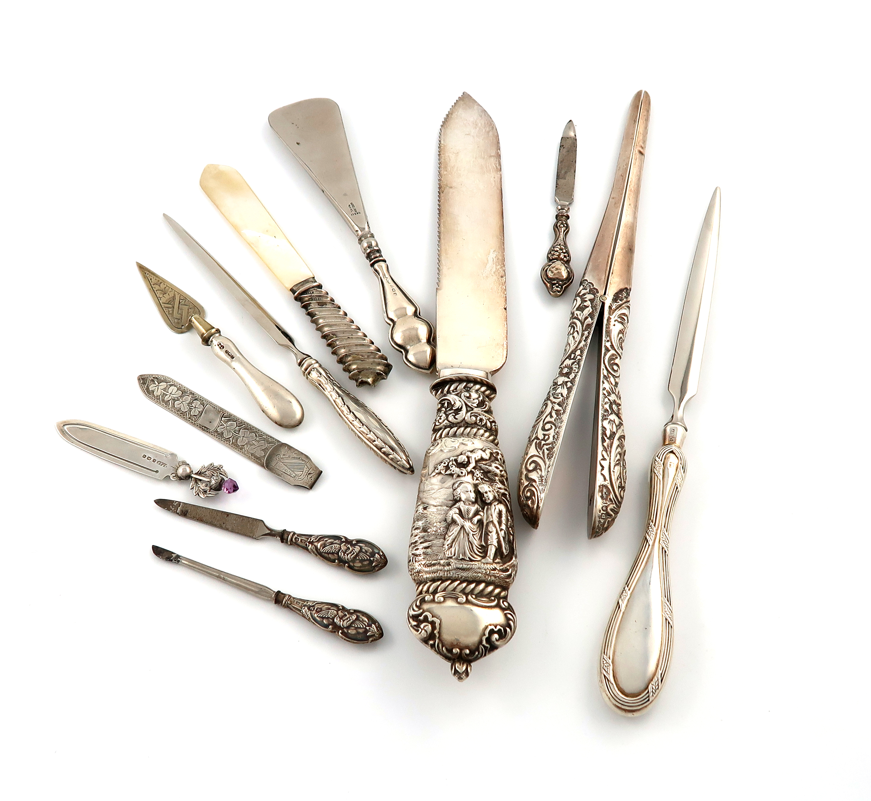 comprising: an Edwardian silver-handled cake knife, by William Comyns, London probably 1905, the handle embossed with children, plated blade, plus three silver-handled paper knives, a page marker with a thistle terminal, two other page markers, a pair of glove stretchers, a shoehorn and three other items. (qty)