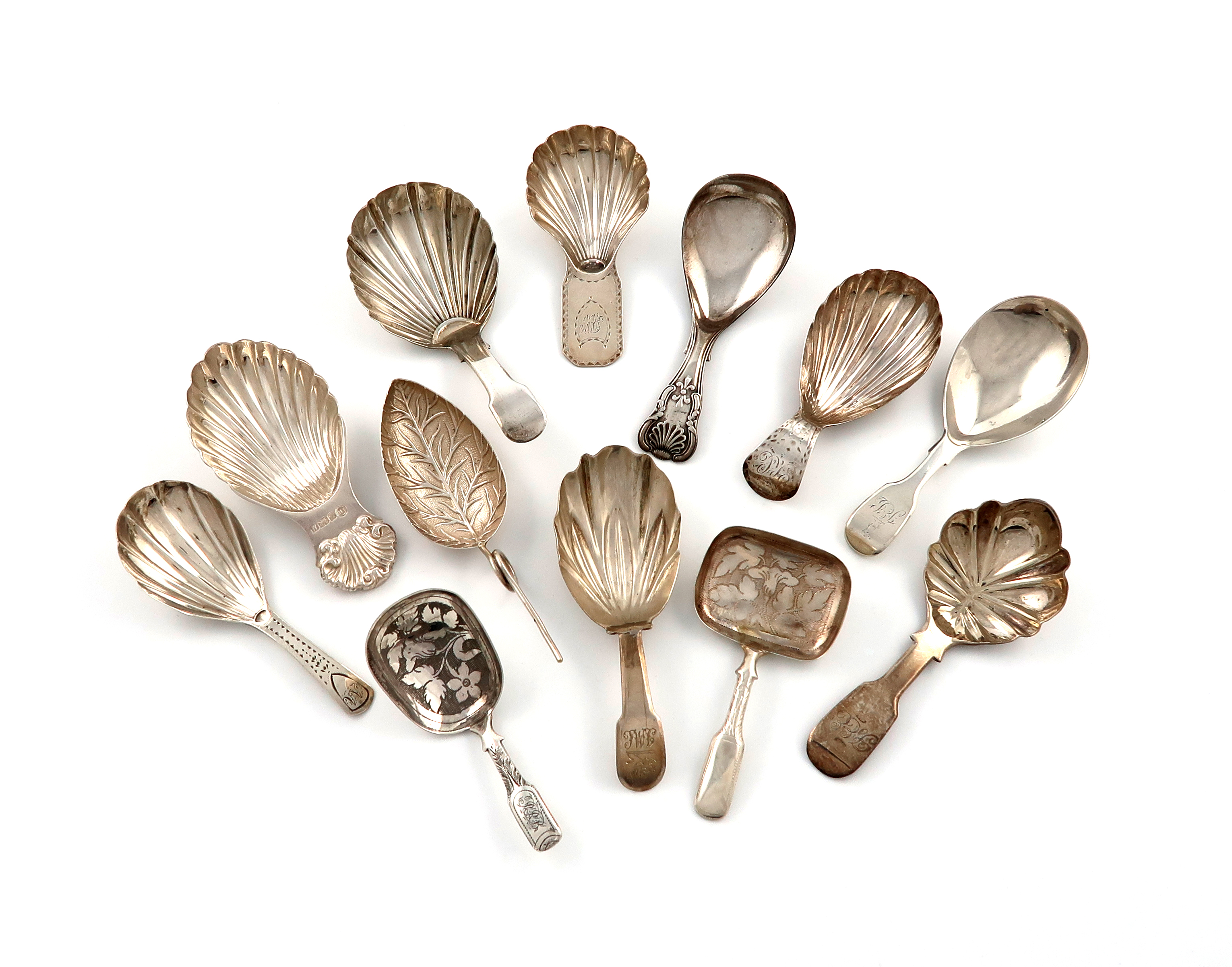 comprising: a Fiddle one by W. R Sobey, Exeter 1848, shell bowl, one of leaf form, one with a rounded rectangular bowl, engraved decoration, by Joseph Taylor, Birmingham 1820, and nine others, various designs, approx. weight 4.4oz. (12)