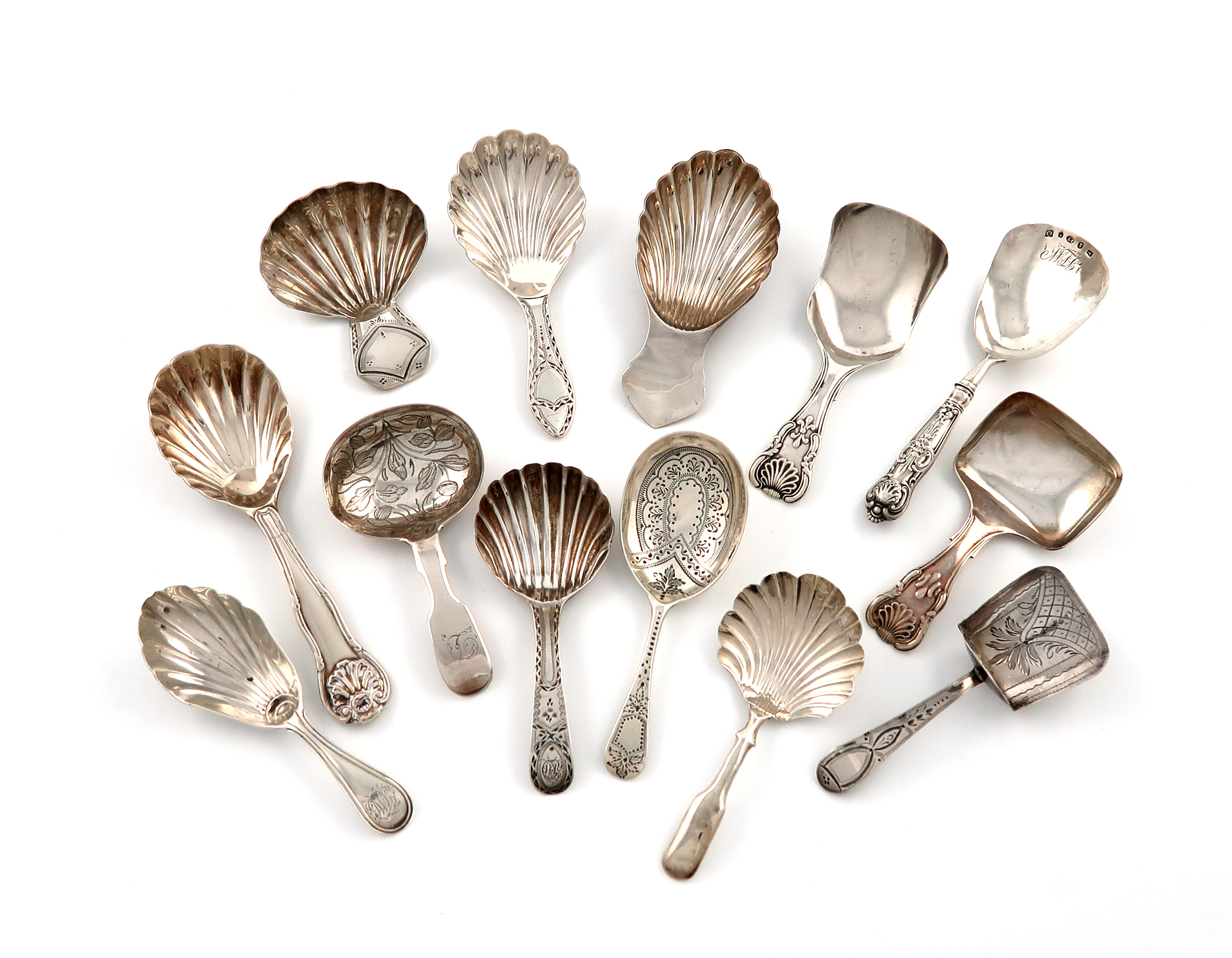 comprising: a King's Husk pattern one, by Eley and Fearn, London 1823, one with a shovel bowl and bright-cut decoration, London 1878, a King's pattern one with a rounded rectangular bowl, Birmingham 1828, plus ten others, many with shell bowls, approx. weight 5oz. (13)