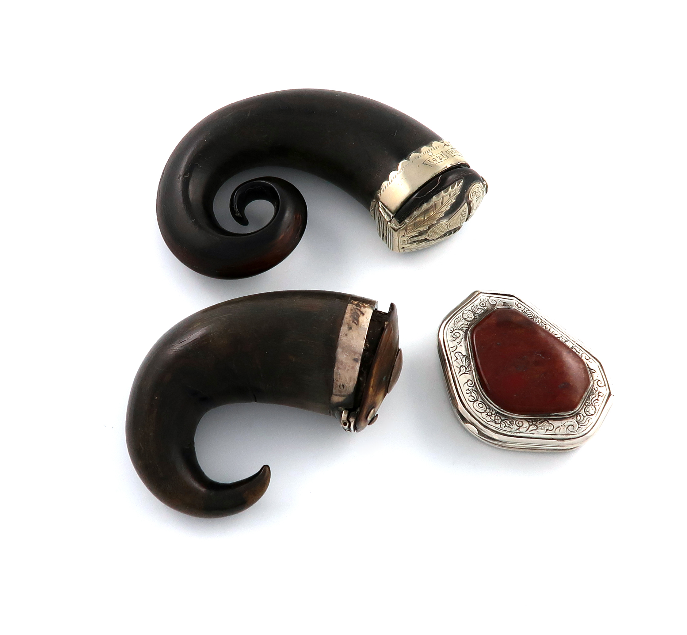 conventional form, the mount inscribed 'William Cranston', plus a base metal mounted snuff mull, also inscribed, and a silver and agate snuff box, the base with a replacement wooden panel. (3)