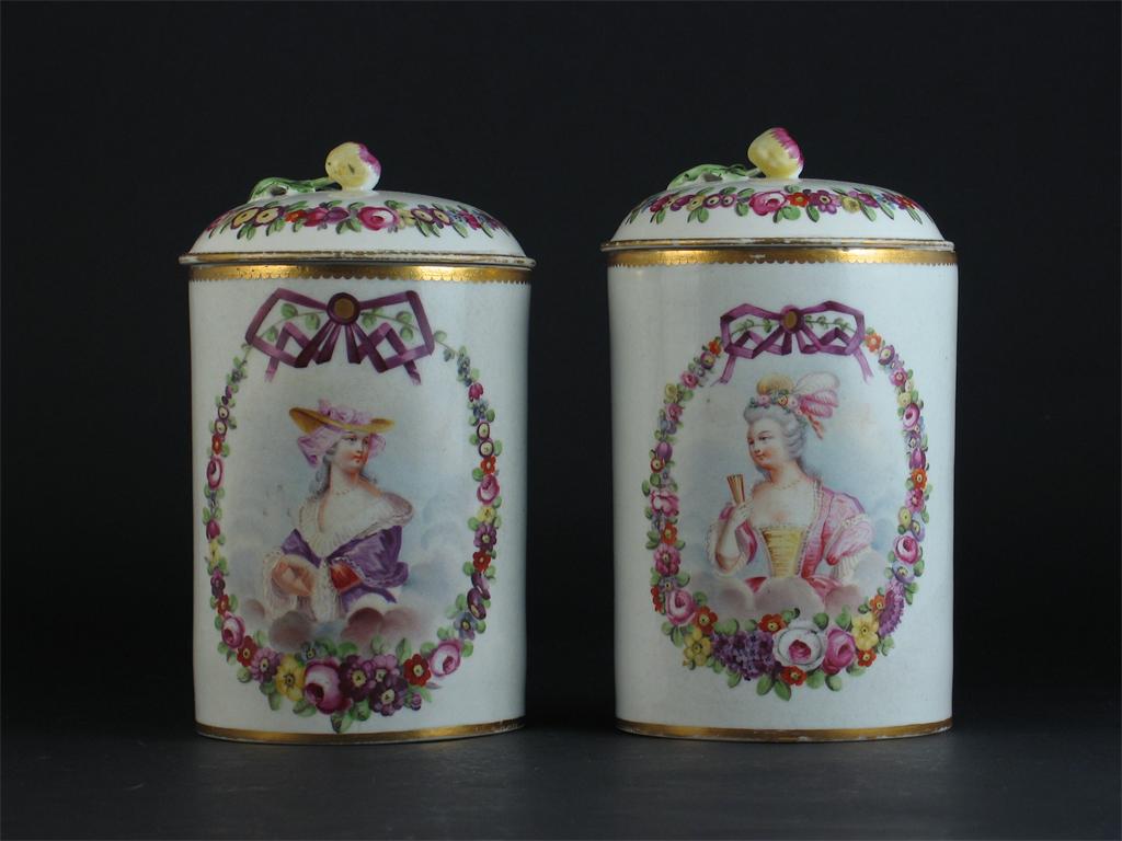 A pair of French cylindrical jars and covers, painted with portraits of pretty young ladies, within floral garlands, crossed arrows marks, probably for La Courtille, 19th century, 19.5cm. (4)