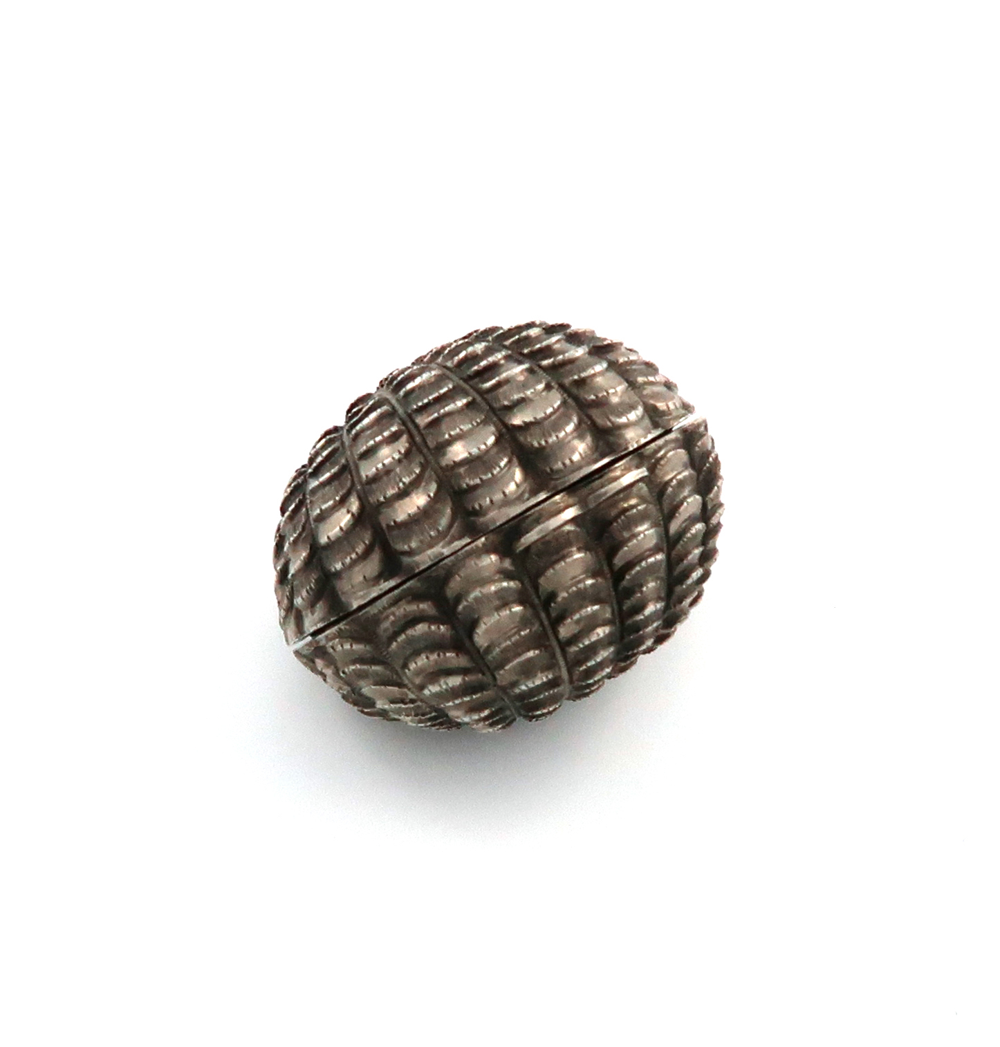 fluted shell form, chased decoration, the hinged cover opens to reveal a hinged steel grater, length 4.2cm, approx. weight 0.7oz.