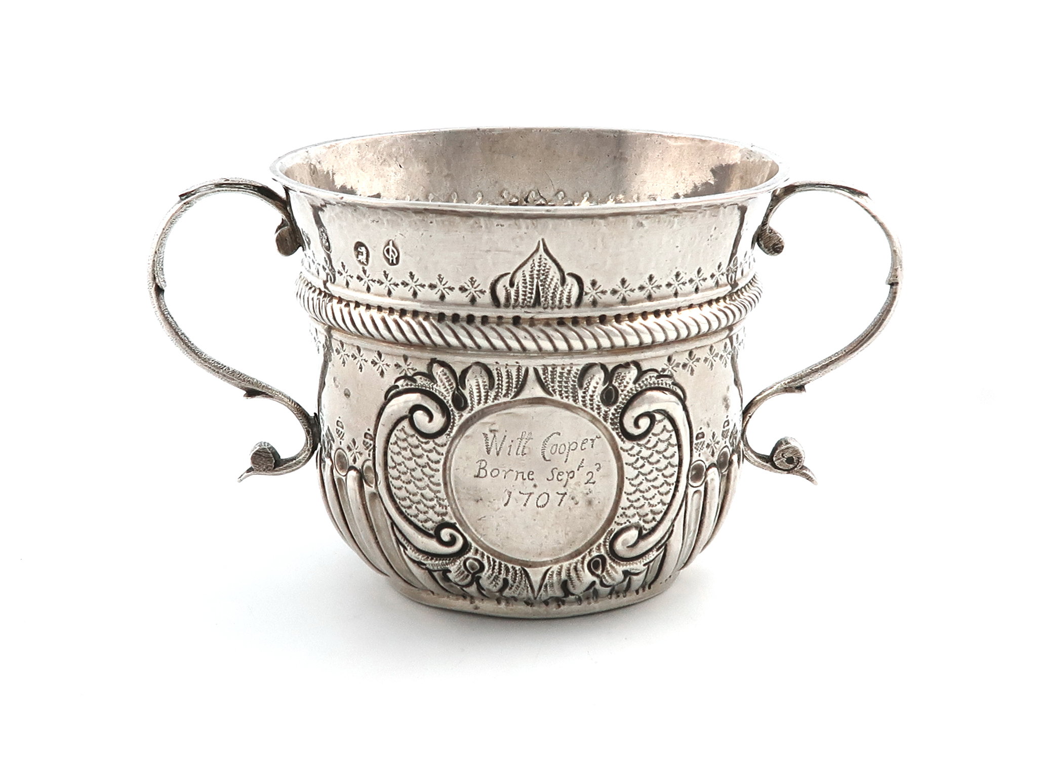 circular form, part-fluted decoration below a rope-work border, scroll handles, the cartouche pricked 'Witt Cooper Borne Sept. 2 1707', height 8.5cm, approx. weight 5.8oz.
