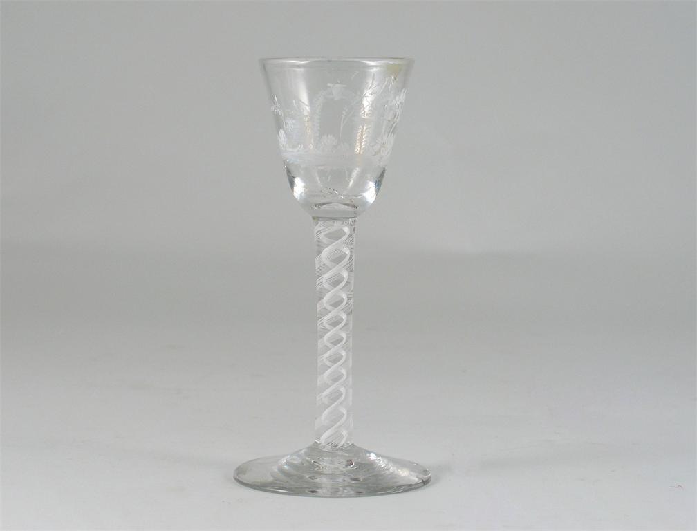 A Beilby wine glass, the bowl enamelled in white, with ruined arches, trees and shrubs, and raised on an opaque twist stem, c.1770. The bowl cracked and repaired. 15cm.