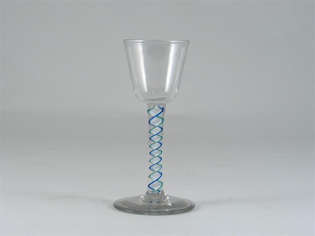 A rare English wine glass, with a rounded bowl, raised on a coloured corkscrew twist stem, with green and blue threads, around a central white spiral. Repaired. c.1760-70, 15.2cm.