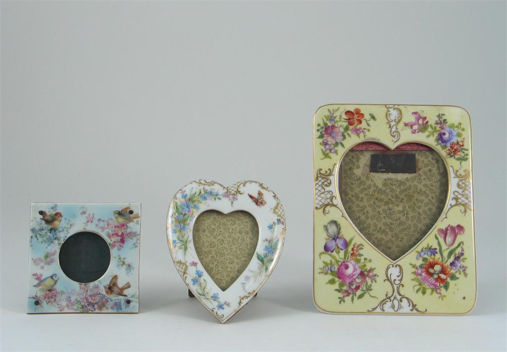 Three porcelain frames, one decorated with song birds, the others with hearts, 21cm. Max. (3)