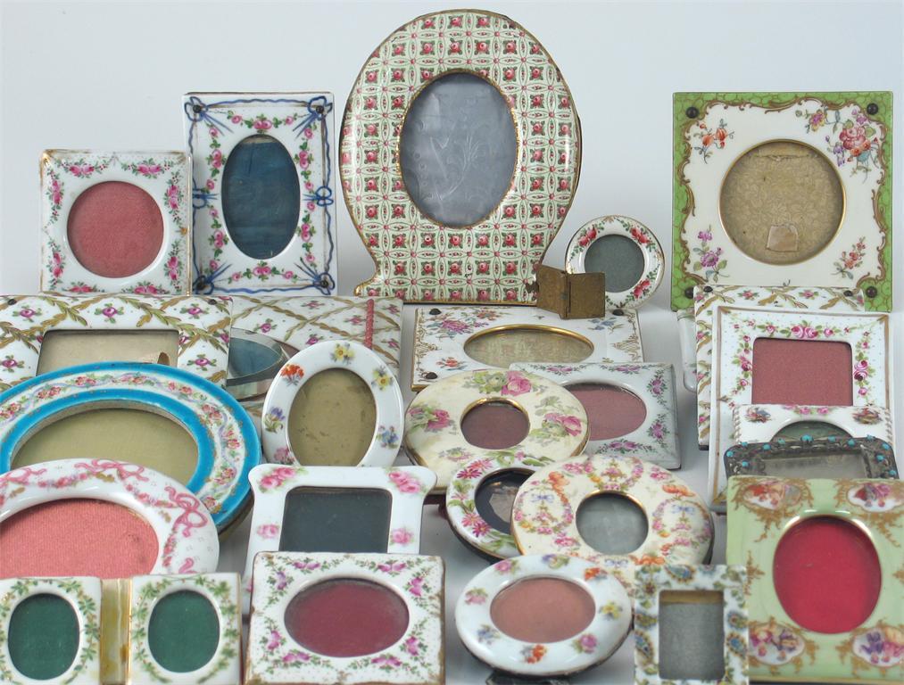 Twenty seven ceramic and metal frames, variously decorated with flowers, figures and foliage, 17.5cm. Max. (27)